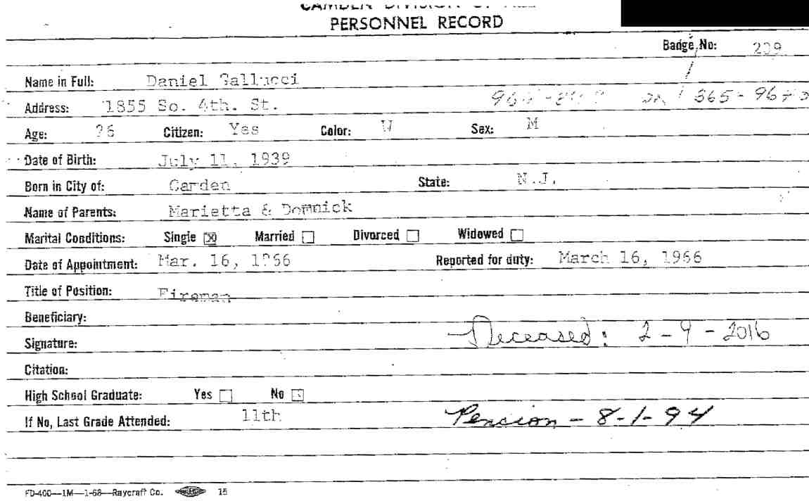 Daniel Gallucci left high school after the 11th grade. He served in the United States Army and in the United States Army National Guard prior to his appointment to the Camden Fire Department on March 16, 1966. When appointed to the Fire Department, he reported his address as 1855 South 4th Street. The Gallucci family left South 4th Street in the early 1970s, around the same time that the Camden Fire Department lifted its residency requirements for firefighters. By 1993 Daniel Gallucci had moved to an apartment in Maple Shade, New Jersey. He retired on pension on August 1, 1994, having served the City of Camden for over 28 years. When his mother passed in 2003, she had been living in Sea Isle City, New Jersey. Daniel Galucci's father had died in July of 1982. Daniel Gallucci was still making his home in his apartment in Maple Shade when he died on February 9, 2016. Daniel Gallucci's uncle, Raymond Paradise, served for many years with the Camden Police Department, during which time he saw duty a member of the K-9 Unit and a homicide investigator. |