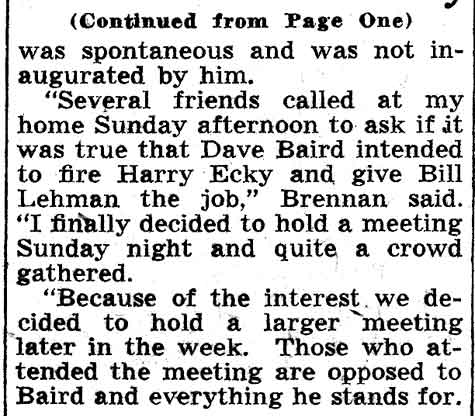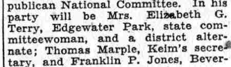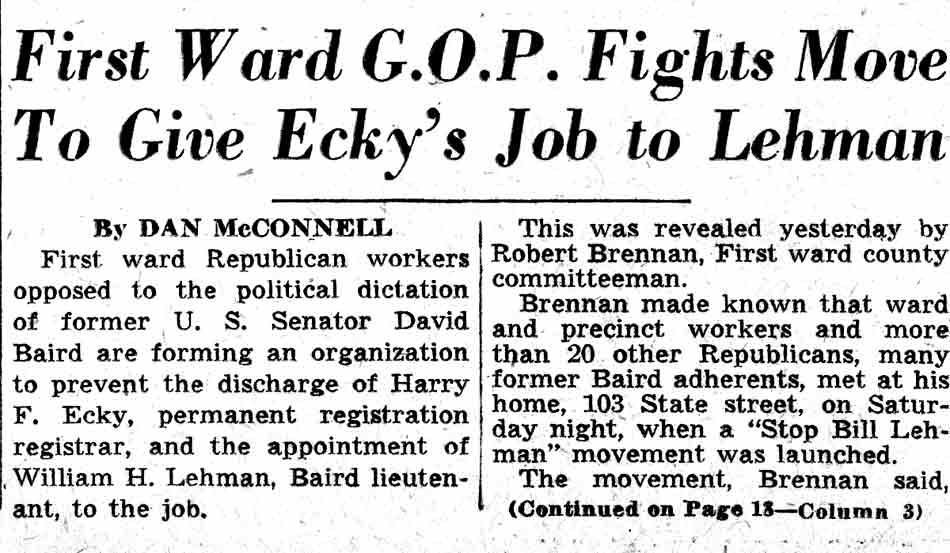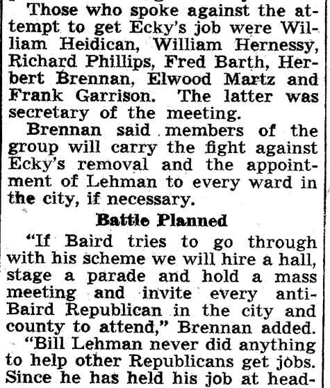 FIGHTS Committee Goes in Huddle on 'King Successor-Comes Out With Headache By MERCURY There isn't a whole lot of patronage available for the Camden county Republicans these' days, but they're fighting like cats about it, anyway. Wednesday was Headache Day for the G. O. P. patronage committee. The committee met for the purpose of picking a successor to William A. E. King on the county elections board. The net result was plenty of names, plenty of arguments, no successor. Among those there at various times were David Baird, County Clerk Leslie H. Ewing. Mrs. Florence Baker, Louis Bantivoglio, Frank Middleton, Mrs. Margaret Wermuth, Mrs. Mary Tegge, Mrs. Anna Holl, Assemblymen Lawrence Ellis and Millard Allen. Other members of the committee, such as Congressman Charles A. Wolverton, Senator Albert E. Burling and Assemblyman Rocco Palese, could not get there. Surrogate Frank B. Hanna could get there and did at 3 p. m., when the meeting was supposed to start. But he left at 3.35 p. m. before the session had got under way. A Baird Order It was reported that the meeting broke up with the general idea that Meyer L. Sakin, local attorney, would be recommended for the job. This, however, was decidedly not a unanimous opinion and, according to some quarters, not even a majority decision. It would be more proper to characterize it as a Baird order. It was rumored that Mrs. Tegge, Mrs. Wermuth and Mrs. Holl opened the hostilities by suggesting that King be allowed to succeed himself. But Dr. Ewing and Mrs. Baker vetoed this-rather enthusiastically. Then Mrs. Holl, it is understood, was asked whether she would support George Walton, a fellow townsman from Haddonfield, but she refused. It is reported that Hanna has suggested Walton for the post and that Dr. Ewing and Mrs. Baker are willing to support Walton. The real fireworks began when William Lehman, manager of the county Republican headquarters, declared that Baird had promised him that none other than William Lehman was going to get the job. It appears that Lehman will soon be in need of the job, as the county committee is now voting on whether to discontinue maintaining the headquarters and Lehman. Lehman Let Down? But it appears that Baird didn't t put up much of a fight Wednesday in Lehman's behalf. So another net, result of the meeting is that Baird and Lehman were walking s on opposite sides of the street yesterday. Hanna was asked yesterday whether Sakin had been recommended. "Yes, I understand they went a on record for Sakin, but I don't know that officially," asserted the state committeeman. "I got there at 3 o'clock, but nobody wanted to start things. It looked like they were just waiting for Dave Baird to come and tell them what to do. I had some legal papers to get out so I had to leave." Another report being circulated yesterday was that Baird wants to put Lehman in the job held by Harry F. Ecky, First ward Republican. Ecky is a registrar for the county election board. His was one of the most popular appointments made in recent years, by the Republicans. Both he and Victor Scharle, Democratic registrar, are not only popular but their work has been universally recognized a extremely efficient. .. |
