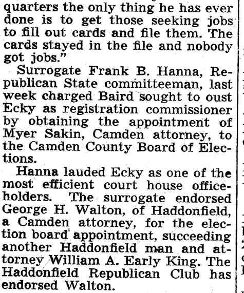 ENDORSED FOR ELECTION POST Haddonfield G. O. P. Heads Accept Hanna Choicefor County Board George H. Walton, Republican county committeeman of Haddonfield, and Camden attorney, last night was endorsed by the governors. of tl1e' Haddonfield Republican Club for appointment to the Camden County Board of Elections. The endorsement was given by 14 of the 18 members of the board. Surrogate Frank B. Hanna, Republican State committeeman, said he previously had offered Walton as a compromise candidate for the job, succeeding William A. E. King, whose term expires March 1. When advised at midnight of the Haddonfield club's action, Hanna made known he had suggested to County Clerk Leslie H. Ewing, chairman of the county committee, and Mrs. Florence Baker, State committee member, that Walton be named as a compromise. According to Hanna, his candidate was rejected by Dr. Ewing and Mrs. Baker. Hanna declared both favor appointment of Meyer L. Sakin, a Camden attorney, who also is the choice of former U. S, Senator David Baird. Hanna said: "The endorsement of Mr. Walton is pleasing to me. He is a real Republican, an outstanding lawyer and bears an excellent reputation In his own community and in other parts of the county. "1 am sure if Mr. Walton is named to the board we will not have any such election scandals as those in Hudson county." "Mr. Sakin is baird's candidate. He wants him to have the job so he can oust Harry Ecky from his job as a permanent registrar. Mr. Ecky is one of the most efficient men in the court house. He has done a fine job, and 1 don't intend to be a party to a plot to punish him because he saw fit, to be an efficient employee." Charles T. Wright, of the Twelfth ward, Nathan Blank, of Oaklyn, and Robert Derowski, of the Seventh ward, also were recommended by Hanna, who stated last night all three were rejected by the baird-Ewing-Baker clique. Hanna said Sakin, the Baird candidate, could not obtain the endorsement of the Thirteenth Ward Republican Club or the two county committee members, E. Howard Broome and Mrs. Anna Saunders, hanna also stated Sakin never had approached him for the position, and he did not know Sakin was in the field other than having baird support.. |
