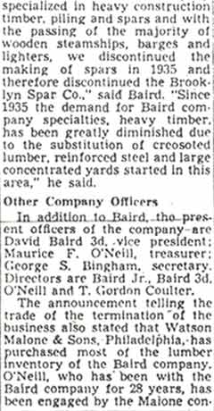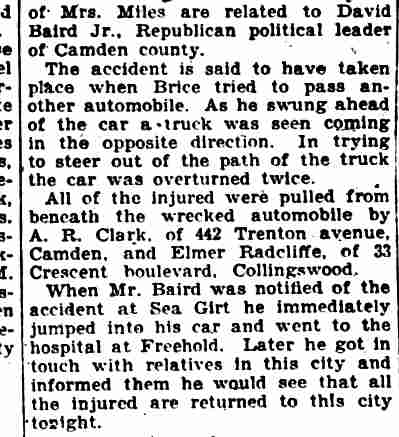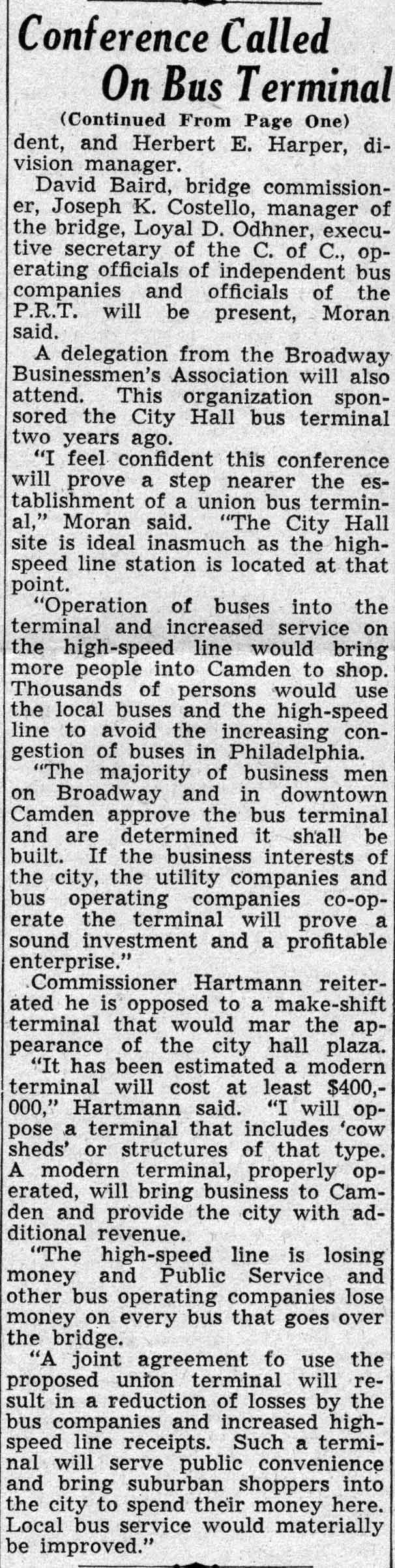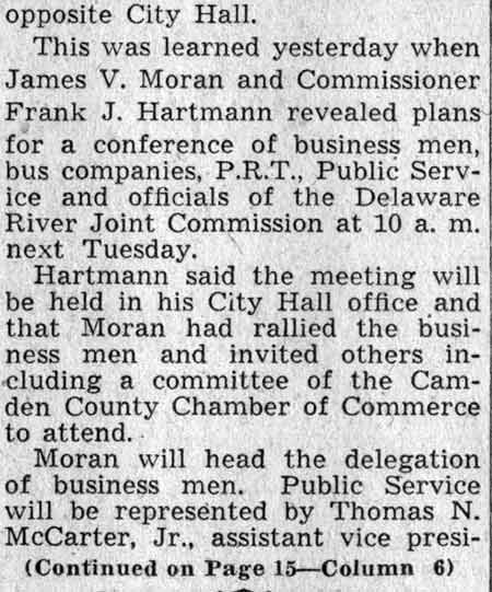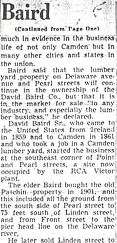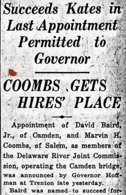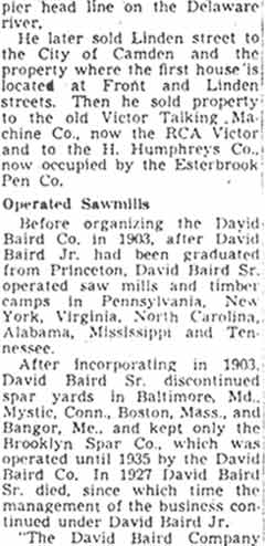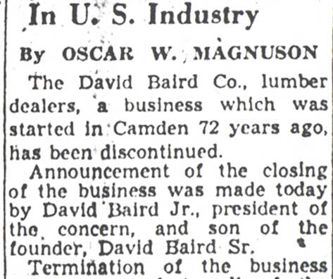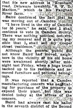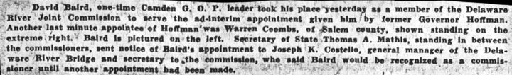 MORE MEN JOIN LEAGUE TO AID BAIRD Forty-seven more prominent professional and business men yesterday joined the Baird-for-Governor Business Men's League and pledged themselves to work actively in interest of David Baird Jr., for governor, and add special impetus to his campaign. The league was organized this week at an enthusiastic meeting of 18 outstanding Baird supporters in professional and business life at the Camden Club, 315 Cooper Street. The league membership is open only to business, professional and industrial leaders who are not holding public office and who are not politicians. The latest enrollments among community leaders pledging themselves to devote themselves to the Baird cause are the following: F. Morse Archer, president of the First Camden National Bank; Clinton. L. Bardo, president of the New York Shipbuilding Company and of the New Jersey Taxpayers' Association; George C. Baker, of the Baker-Flick Company; Watson Shallcross, president of the Camden County Chamber of Commerce; Howard J. Dudley, Broadway merchant; Thomas E. French, prominent attorney; J. David Stern, publisher of the Courier-Post newspapers and of the Philadelphia Record; Wellington K. Barto, of the West Jersey Trust Company; Dr. Joseph Roberts, Cooper Hospital; William Clement, of the Clement Coverall Paint Company; Robert Wright, of the Haddonfield National Bank; Arthur J. Podmore, of the Camden Pottery Company; Nathan Leopold, Haddonfield druggist; Dr. J. Edgar Howard, of Haddonfield. Dr. Alfred N. Elwell, of this city; Edward Preisendanz, Clarence Peters, N. Franks, of. Franks & Sweeney; U. G. Peters, Ralph D. Baker, prominent real estate man; Archibald Dingo, George Bachman, Sr., and George Bachman, Jr., Dr. O. W. Saunders, Henry Cooperson, Leon Cooperson, Herman Z. Cutler. Charles Bauman, Harry Rose, George Austermuhl, Walter Gulick, Albert Voeglin, Howard Fearn, John A. Schlorer, Ernest L. Bartelt. William S. Casselman, George M. Carr, J. Price Myers, Carl R. Evered, former president of the Camden County Real Estate Board; Francis B. Wallen, former president of the Camden County Chamber of Commerce; William H. Alff, Edmund J. Alff, Harry Pelouze, Walter Campbell, Dr. Thomas R. Bunting, Joseph F. Kobus and Henry E. Kobus. Enrollments, it was announced, may be made through the following committee of the league: Ludwig A. Kind, Thomas Gordon Coulter, Charles H. Laird, Walter J. Staats, Frank C. Middleton, Jr., Frank J. Hineline, William T. Read, Charles S. Boyer, W. W. Robinson, George R. Pelouze, Paul A. Kind, Dr. Paul A. Mecray, Jerome Hurley, Harry A. Moran, James V. Moran, William J. Strandwitz, former Judge Lewis Starr and Frank C. Norcross. |