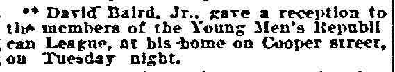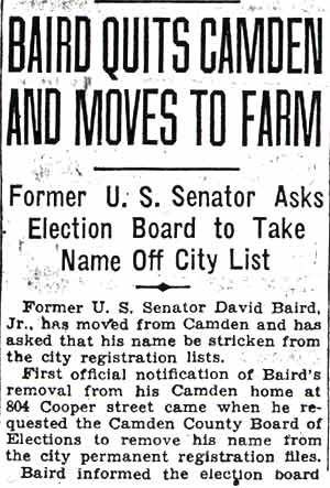 David Baird Jr. was born in Camden NJ on October 18, 1881. His father, David Baird Sr., was one of Camden's leading citizens for well over 50 years, an important man both in the business and political life of Camden, Camden County, and South Jersey. David Baird Jr. attended the Raymond Academy at Camden and Penn Charter School in Philadelphia PA, after which he graduated from Lawrenceville NJ School in 1899 and from Princeton University in 1903. After graduation from Princeton, David Baird Jr. returned to Camden, and went into his father's lumber business, the David Baird Company. By 1916 he had joined his father on the Board of Directors of the First National Bankof Camden. He later took his father's place as a dominant figure in Republican party politics in Camden City and Camden County. David Baird Jr. was a founding member of the Tavistock Country Club, and was involved in the behind the scenes tactics that led to the incorporation of Tavistock as an independent borough, despite its population of less than 20 people. In 1924 he purchased an interest in the Camden Post-Telegram from then Congressman Francis Ford Patterson Jr. The rival Camden Courier had been running stories highly critical of the elder Baird and the Republican party, and which had contributed to the defeat of acting Mayor Fran S. Van Hart by 800 votes in 1923. David Baird Jr. was unable to maintain the fortunes of the Post-Telegram, and his father brokered a deal selling the paper to Courier owner David Stern in January of 1926. The Courier remained highly critical of Baird Jr. throughout the 1930s and 1940s, and this criticism certainly contributed but was in no way solely responsible for his political decline during those years. In 1929 David Baird Jr. was appointed as a Republican to the United States Senate to fill the vacancy caused by the resignation of Walter E. Edge, and served from November 30, 1929, to December 2, 1930, when a duly elected successor qualified. He was not a candidate for election to the vacancy in 1930. At the height of his political fortunes, Baird Jr. returned to New Jersey, and ran unsuccessfully for Governor of New Jersey in 1931. After his defeat in the general election, he resumed his former business pursuits. Still the dominant force in local and county Republican party politics, he engaged in a bitter intra-party battle with Albert S. Woodruff throughout the 1930s. While his slate, co-headed by political ally Florence Baker, defeated that led by Woodruff and Elizabeth Verga in the May 1934 election, the deep divisions within the party contributed to rise of the Democratic machine headed by George Brunner that would dominate Camden after 1935. David Baird Jr. moved out of Camden to a farm that he owned in a rural part of Delaware Township in October of 1936. His father had acquired the home at 804 Cooper Street in the 1890s, the mansion built by real estate developer Edward N. Cohn in the late 1880s. Even though David Baird Jr. had to deal with problems with his own county organization, he still commanded considerable support. He was appointed by the Governor to the Delaware River Joint Commission (the forerunner of the Delaware River Port Authority) to fill an unexpired term in 1938. David Baird Jr. acquired an interest in the Smith-Austermuhl Insurance Company, and by 1947 was the president of that enterprise. On June 7, 1950 he announced the closing of the David Baird Company lumber business that his father had founded in the 1870s. The Baird family remained in lumber for many years, operating the Haddonfield Lumber Company. David Baird Jr. died in Camden NJ on February 28, 1955, and was interred in the family mausoleum at Harleigh Cemetery. in Camden NJ. |