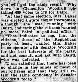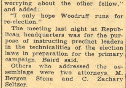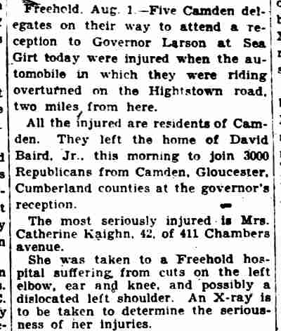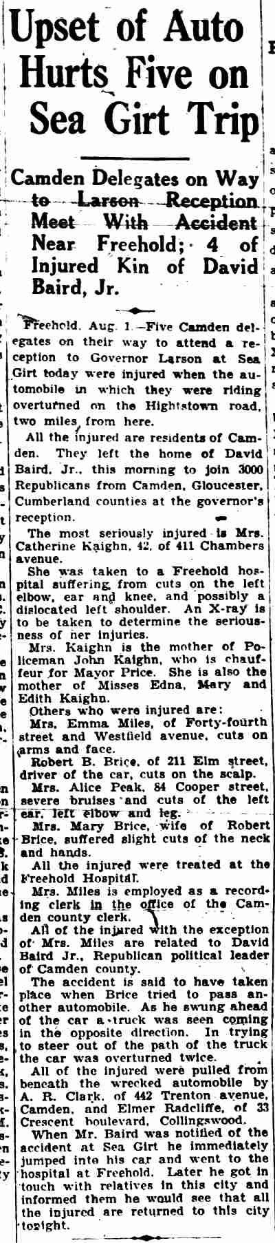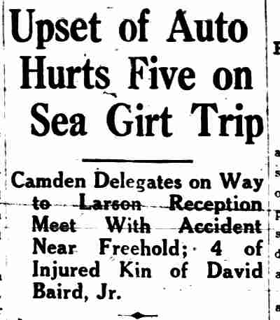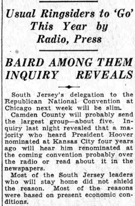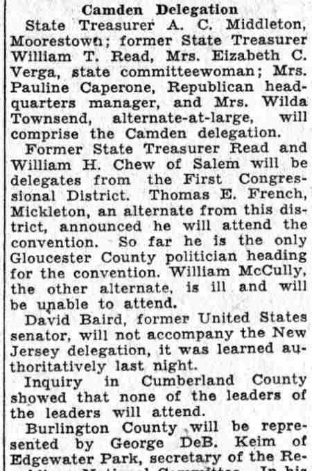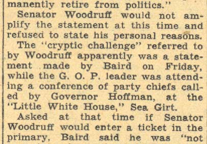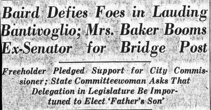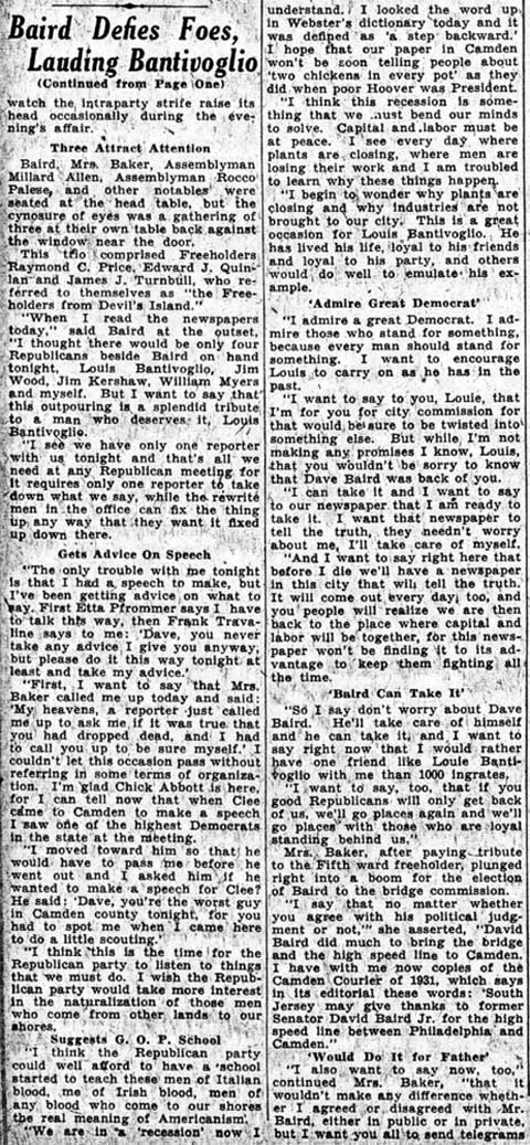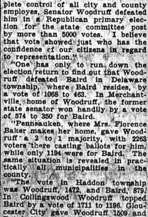 AND LARSON AT BIG RALLY TODAY David Baird and Governor Morgan Larson will be the principal speakers this afternoon at a rally of more than 5000 Republican workers and other Baird supporters at Convention Hall. Walter S. Keown, chairman of the Camden County Republican Committee, and Mrs. Elizabeth C. Verga, State committeewoman and vice chairman of the county committee, will preside at the rally. E. Bertram Mott, chairman of the State committee; Representative Charles A. Wolverton and other State and county leaders are expected to attend. Workers from all sections of the county are expected at the meeting. Reports received at Republican headquarters will be made to the workers on the progress of the campaign. Leaders in baird's campaign for election as Governor said last night that reports from various sections of the State show increasing baird strength in Democratic strongholds, principally Hudson county. They said his popularity throughout the State has increased materially in the closing days of the campaign, as-suring his election by a large margin. "Voters are intelligent and they have been able to see through the smokescreen the Democratic speakers have created in desperate attempts to blind them to the real facts," said Mrs. Verga. "They have been informed of the scandalous conditions in Hudson County, and they will, make certain next Tuesday that the Hague stranglehold will not reach to other sections of the State. "The increasing strength of baird throughout the State has made his opponents frantic, and they are resorting to desperate means in a futile effort to turn the tide. They are aware that the citizens of the State do not intend to be hoodwinked by promises and will vote for a man who truly has their interest at heart, and will do all within his power to advance the cause of the State and its citizens. He has demonstrated his ability and sincerity many times, not only in the interest of the people of South Jersey, but for citizens throughout the State. “I am confident he will be elected by large plurality and will be the greatest Governor in the history of the State.". |