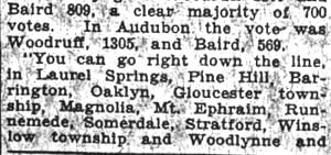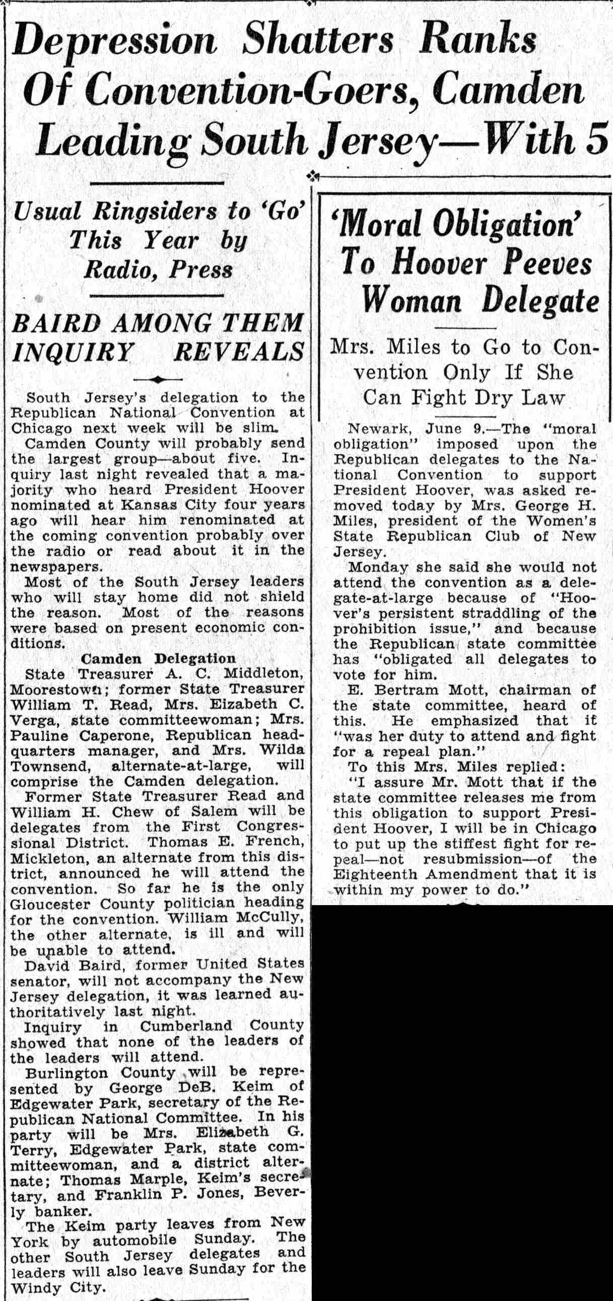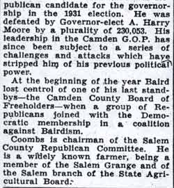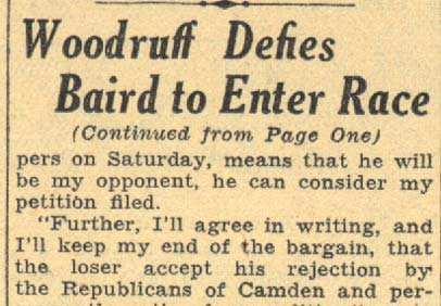 Political Paragraphs A. Harry Moore, Democratic candidate for governor, is scheduled to speak at the meeting of Gloucester Democrats in the city hall there next. Wednesday night. The meeting will be in charge of Mayor J. Emerson Jackson and the county Democratic committee. Gloucester Republicans tonight will hold a rally at the headquarters of the city committee, 104 North King Street. The Polish-American Women's Citizens Club, in its recent resolution pledging support to David Baird, endorsed a candidate for the first time in the club's six-year history, according to Mrs. Priscilla Ciechanowski, secretary. The club is two to one for Baird, she said. Other officers are Mrs. A. Bec, president; Mrs. H. Stojak, vice-president, and Mrs. A. Skierska, treasurer. A huge new sign, in vivid lettering, has appeared on the east side or Admiral Wilson Boulevard, south of Baird Boulevard, urging a vote for Baird November 3. It is one of the largest campaign signs in Camden County. Congressman Charles A. Wolverton is appearing almost everywhere with Baird. The congressman is one of the gubernatorial nominee's ablest campaign advisers. He was with the candidate at the Trenton convention of the New Jersey Taxpayers' Association Wednesday. David Tattersdill, Broadway merchant, is among the latest members of the Speakers' Bureau at Republican headquarters, Broadway and Stevens Street. He is one of the organizers of the Forty-second Street Baird Boosters' Club. Seventy-two hundred applications for challengers were received Tuesday afternoon, the deadline, by the Camden County Board of Elections. Of the total, 4000 were for challengers for Republican candidates and the remainder for Democratic candidates, including those seeking office as governor, freeholder, justice of the peace and various borough and township offices. No Socialist or prohibition applications for challengers were filed here. Joseph A. Varbalow, former assistant prosecutor, was so eager to read Moore's speech he had to borrow a cent from Chief of County Detectives Lawrence T. Doran to buy the Morning Post. |