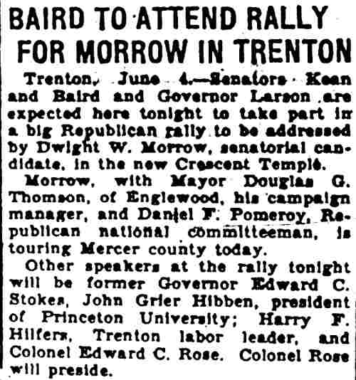 CAMPAIGN CALLED ‘VILLAINOUS’ By Staff Correspondent North Plainfield, October 30- The Democratic campaign of A. Harry Moore has "degenerated into a villainous orgy of slander," Congressman Charles A. Eaton declared in an address at a Republican mass meet-ing here tonight. Urging the election of David Baird, the Republican candidate for Governor, Eaton blasted the Democrats for their distribution of "filth, contemptible, lying propaganda." "The gas-house gang, under the leadership of the Democratic machine in Hudson County has thrown off its mask of piety and decency," he declared. "In these last days the Democratic organization is resorting to a campaign of lies and slander which will merit and receive the abhorrence, contempt and resentment of the great mass of Democratic voters as well as those of the Republican side. “No self-respecting citizen would permit his candidacy for office to be advanced by such contemptible prop-aganda unless he had become so panic-stricken as to lose all self control. ‘Filthy Papers Issued' "In the past week there has been distributed from Democratic headquarters in the City of Camden a villainous tabloid published in Hudson county which contains the most atrocious attack upon the moral character of Senator Baird and holds up to the public obliquy the fair name of some of the outstanding men and women of that city who happen to be Republican. In addition there is being distributed throughout the City of Camden a most contemptible series of leaflets and cartoons attacking the character of Mr. baird. These leaflets which are unworthy of the filthy imaginations of the lowest thugs in the land have printed on them the following statement, "Paid for by the Democratic Executive Committee." "On behalf of the decent citizens of this State I now ask A. Harry Moore a few questions.” "Do you, Mr. Moore, approve of this kind or political character assassination on the part of your organization? Have you done anything to stop the circulation of these vile slanders? Do you personally believe that Mr. Baird's campaign is being financed by prostitutes, beer barons, white slavers and other creatures of the underworld? If you know these things are going on and haven't stopped them, what becomes of all your fine talk to the Christian people of this State during the last three years about charity and religious and Christian character? Asks for MilitiaThe unfortunate impression has gone through the State, Mr. Moore, that you know all about this. Under your direction an appeal was recently made before Judge Lloyd to have some special precaution taken to insure a fair vote in Camden. You even asked for the State militia to be called out and a worthy judge turned the whole thing down as a piece of miserable political propa-ganda with which no court ought to soil its hands. 'I believe this hypocritical, lying "Propaganda against the character of David Baird will result in giving him the largest vote a political candidate has ever had in Camden county. Indeed, I think this kind of thing signs your death warrant, Mr. Moore as a candidate for the Governorship. You train with too tough a gang to be trusted with the high responsibilities of the Governor's office. Either you are not as good as you would like to have us believe or you are too weak to keep the character assassins who are working in your interests out of the limelight. |