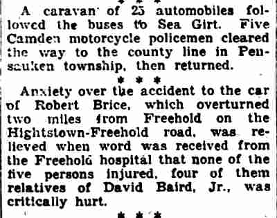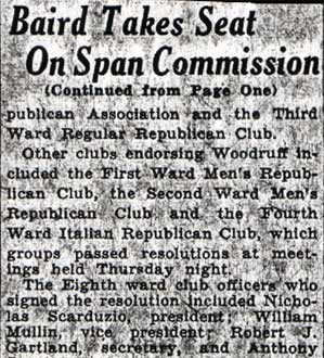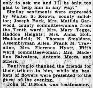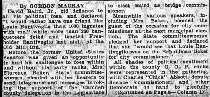 Political Paragraphs Gloucester Republicans concluded their final Baird rally of the campaign last night at their headquarters, 101 North King Street. Polls throughout the slate will open for the general election Tuesday at 7 a.m. and close at 8 p.m. All voters in the polling place at 8 p.m. or in the room "'here the election is taking place, or in line, shall be permitted to vote, under the law. Election officers have been instructed to place a police officer at the end of the line at 8 p.m. Black Horse pike Republican factions have united in a combined front to further the candidacy of David Baird, Jr., for governor. There are no local fights in the party during the current campaign. There were intense local primary battles, principally in Runnemede and Gloucester Township, but all factions in those municipalities are now working for Baird. A bitter contest for justice of the peace in the Eighth Ward will be waged at the election on Tuesday. William Lane, of 1634 Broadway, is one of the seven seeking one of three vacancies. Lane is the nephew of James M. Lane, who was prominent politically several years ago. He is a captain in the Moose Lodge bugle corps. He is also secretary and treasurer of the Regular Eighth Ward Republican Club. Of the seven men running for justice of the peace, four are Democrats. Mrs. Emma E. Hyland, Democratic state committee woman, and Assemblyman George D. Rothermel are wagering each other a hat on the outcome of the gubernatorial race between Baird and Moore. Rothermel, however, will have to pay more for a hat for Mrs. Hyland, should Baird pay for a fedora for Rothermel, should Moore be defeated. A revival of the old-time political parade was staged last night by the First Italian Republican League when more than 200 automobiles and several hundred marchers passed through Camden streets to the accompaniment of stirring music. Led by former Coroner Antonio Mecca and County Detective Fiore Troncone, the parade passed from the league's clubhouse, 813 South Fourth Street, to West Street, to Benson Street, to broadway, past the Republican headquarters, to Mickle Street, to Third to Chestnut and back to the clubhouse. Meetings held on various floors of the clubhouse drew several thousand voters.. |