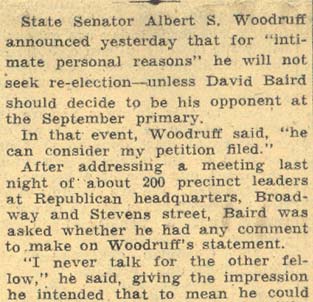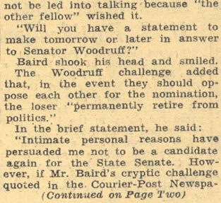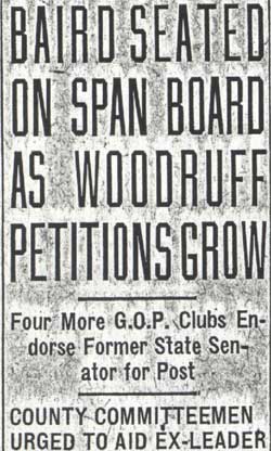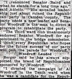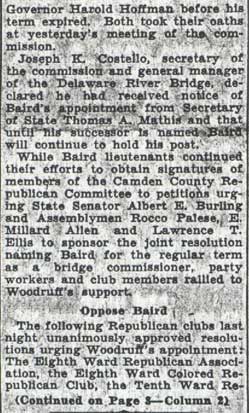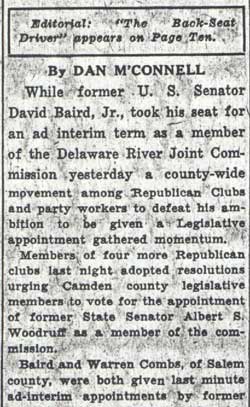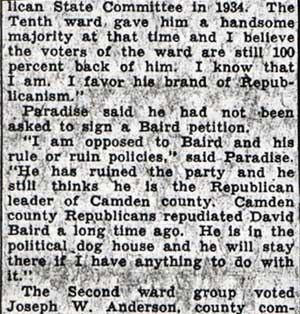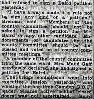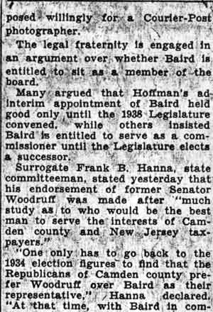 BLOCKS COUP An attempted coup by David Baird in his drive to rebuild his fallen fences for the primary election next May was frustrated yesterday by one lone freeholder, and the baby member of the board, at that. Edmund A. Walsh elected from Camden's Eighth Ward to fill the unexpired term of the late Ferdinand J. Larkin, foiled Baird's well laid plans when he refused to attend the annual organization meeting after the Republican League bloc of freeholders had been maneuvered into a position of agreeing to support James W. Wood, Baird satellite, for director.. A spokesman for the League group said the agreement was nullified, however, by yesterday's adjournment. Walsh's loyalty to City Commissioner Mary W. Kobus, long-time political foe of Baird, had the effect of stalemating the 1940 organization, the last under the large board, since the Democrats, upon learning of the G.O.P. decision to support Wood, bolted the meeting room. "Refused to Sell Out" Walsh took the stand that to vote for Wood would be to sell out to Baird. Walsh was ready and willing to vote for any other Republican. At no time was he for a Democrat.. The 20 Republican freeholders present could have transacted business and elected Wood if they had gone into session, but Walsh's refusal to be a party to the Baird-Wood scheme left only 19 freeholders willing to meet, and that number is one short of the quorum required by law. When shortly after 5:00 PM- five hours after the statutory time for reorganization- there was no indication that wither Walsh or the Democrats would return. Wood, J. Alfred Beck, president of the Republican league, and Maurice Bart, floor leader for the Democrats, conferred and agreed to adjourn until next Monday. Price Furnishes Surprise Walsh emphasized that he favors Republican organization of the board and agreed to support any Republican for director except Wood. These are the sentiments of Mrs. Kobus. Too, it was the stand of the Republican League until at yesterday's joint conference of the three G.O.P. factions the group headed by Raymond G. Price cast its lot with Wood. This in itself was a major surprise of the day, since Price and Edward J. Quinlan both elected with Kobus support had been considered anti-Baird-ites. |