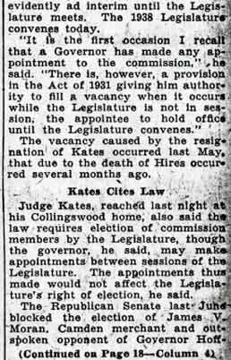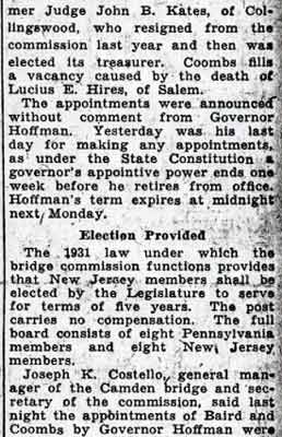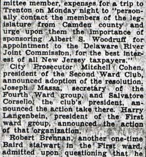 IS GIVEN $4000 JOB OVER HOT PROTEST BY ‘REBEL’ IN G.O.P. Joseph H. Van Meter, insurgent Republican freeholder from Collingswood, today declared that David Baird Jr., Republican leader, had admitted that Theodore Kausel was “not the man for the job” to which he was appointed by the Board of Freeholders yesterday. Baird told him, however, said Van Meter, that a promise had been made “to take care of” Kausel because of the latter’s aid to the Republican Organization at the last municipal election. Van Meter quotes Baird as follows: “I’ll admit that Kausel is not the man for the job. But you have to help me out because we promised to take care of Kausel when he came over to us in the city election. And it was through Kausel that we got Hitchner and a lot of his crowd.” “We’ve got ourselves tied up with him. We’ve got to take him, and I want you to go along, and help me out”. “I know his business record and I know his political record. I know the freeholders don’t want him and our conference don’t want him, but we’ve got to eat crow, and I want you to help me out” Under the watchful eyes of organization leaders, Republican members of the Camden County Board of Freeholders yesterday took care of Theodore “Teddy” Kausel. With David Baird Jr. and other chieftains of the party occupying front row seats, the board created the post of “general manager of county institutions and promptly named Kausel for the job at an annual salary of $4,000. Like ghosts at a feast, Baird and the other party leaders sat silently at the freeholders reorganization meeting. Like actors in a carefully pre-arranged play, a little uncertain of their cues, 20 Republican freeholders cast furtive eyes at the group of spectators. They said no word, these freeholders. They made no reply when Joseph H. Van Meter, of Collingswood, breaking from their ranks, declared that 20 of them had told him that Kausel was unfit for the position to which he was being appointed. They listened in uncomfortable silence while Van Meter gave voice to a scathing denunciation of their “lack of backbone” and while a running fire of sarcasm from Democratic members fell upon their ears. Scene Was Drama The scene was drama. It might have been a revised performance of “Uncle Tom’s Cabin” with 28 furtive-eyed Uncle Toms and an impregnable line of Simon Legrees, cracking invisible whips in threatening gestures. And the scene was also comedy. For of that score of men who, according to Van Meter, had agreed that Kausel was unfit for the job but “had to be taken care of,” none arose to protest against the action. Within their Hearts the chorus of Uncle Toms may have been saying. The county may own out bodies, but our souls belong to the Republican Organization.” But if they thought this, they said no word. Today it was pointed out that it will not be long before freeholders come up for renomination at the primaries. Today, it was also predicted that Van Meter has signed his political death warrant so far as the Republican organization was concerned. But at least he received the ungrudging tribute of the Democratic minority on the board, who joyfully proclaimed that they had found “at last a Republican with guts.” Van Meter Fights Hard Van Meter spared no words, took no half-measures. He accused his fellow Republican members of coercion, double- dealing and weakness. He fought the appointment bitterly. He raked up the vocational school matter, in which $85,000 had been paid for the school site on Kausel’s recommendation, a price later declared to be exorbitant. Democratic members joined the Collingswood insurgent. They charges that the $4,000 appointment was the price of Kausel’s allegiance to the Republican party. They declared that he wasn’t worth it. They recalled, later, that Kausel had shifted from the Republican Organization to the Non-Partisan movement and then back again after being one of the loudest to criticize the Organization. They asserted that after his removal as chairman of the vocational school board, he had sought the appointment as city purchasing agent. They avowed that the Republican City Commissioners had ‘refused to handle Kausel” and had “wished him off on the county.” The 26 other Republican freeholders- all of those present, excepting only Van Meter- continued to listen in silence. And when the vote came, every one of the 26 voted for the creation of the position of “general manager of county institutions” and for the appointment of Kausel. A little later the reprisals upon Van Meter began. He was removed from the central plant and county farm committees of the board, shifted to the elections committee and allowed to remain on the printing and agricultural committees, regarded as unimportant groups. Reprisal Were Threatened “It doesn’t surprise me,” he said. “I was threatened with it. They told me they’d ruin me. But I couldn’t go back to Collingswood and ask the people to vote for me again if I hadn’t fought against this appointment.” The defection of Van Meter came apparently as a surprise. The meeting had opened with the passage of the county budget on the first reading, the selection of Leslie H. Ewing, of Berlin, as director of the board, the calling of Frank P. Moles, of the Third Ward to be sworn in and his failure to respond or to appear for the gathering. Minor matters had been attended to and then Fred W. George, clerk of the board, rose to his feet and began the task of reading a long list of proposed amendments to the rules. Buried far down in the list of revisions was that which, “for purposes of economy”, sought to place all county institutions under a central head to be known as general manager. George lost his breath before he had more than half completed the lost of amendments, and George Rothermel, pinch-hitting for Walter Keown as counsel for the board, took his place. Then Director Ewing called for a vote. Schorp