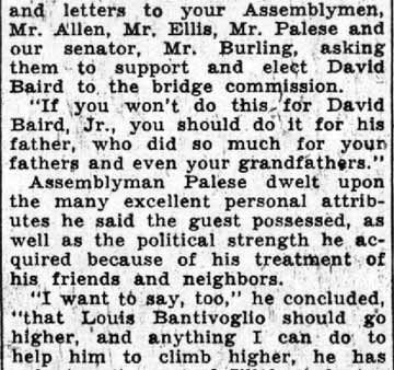 OF JERSEY LAUDED BY BAIRD By Star Correspondent Hoboken, Oct. 12.-Americau business, religion and government need today a man like Christopher Columbus "who can fire the imagination of our countrymen and awaken the nation to the dangers that threaten our safety and freedom," david baird jr. , declared this afternoon at the dedication of Columbus Park here. Addressing a group composed mostly of Italian-Americans, the Republican candidate for governor touched only lightly on political is-sues of his campaign but pleaded for "clean government" so that "the tax dollar may be honestly spent and your right to work protected." "We are celebrating today a great event in the history of the world," Baird said. "We are paying tribute to the courage and the vision of one of your famous countrymen. We are recognizing in this official holiday and in this great gathering, the energy, the leadership and the contributions of the Italian people to world civilization.” "American citizens of Italian ancestry should be proud of their heritage.” "I am proud to salute New Jersey's half million citizens of Italian parentage on this Columbus Day. They are among the most industrious and progressive of our population. As private citizens and in public office, they are doing their part toward the building of a greater state and in establishing the ideals of honesty and integrity in the conduct of public affairs.” "Columbus set out to find a pass-age to India. He discovered a new world. He hoped for a new era of commercial expansion. He found a land of new opportunity. He sought easier communication between distant people. He blazed the trail to a western world where liberty and equality was to have its greatest experiment. The dream of something great and strong and fine must pre-cede its realization. There must always be men like Columbus with courage to follow their dreams. There is needed today leaders in business, in religion, in government, who can fire the imagination of our common countrymen and awaken it to the dangers that threaten our own safety and freedom.” "Every age and period brings to us as individuals and as citizens of a great state, its own problems. In the period of expansion and great prosperity through which we have been passing, we, in this state and throughout the country, have forgotten our public responsibilities in the interest of clean government. The great tragedy of American life is not prohibition, the crime wave, or the economic depression. It is the indifference of our citizenship toward their own community and state re-sponsibility. "Make no mistake about the seriousness of the problem that is before you. The enemies of clean government are strongly entrenched and know their power. The fight will not be won in a day. But there is no system that will withstand the power of a united people demanding the return of their government to its rightful owners.” "The battle for clean government in New Jersey must appeal to the: hearts and the traditions of the Italian people. The issues of the day are not the small advantages that are promised in an effort to draw away your attention from the sourc-es that threaten your welfare and happiness.” "Having once charted his course and set his compass, Columbus pushed on in spite of all opposition. Those who do him honor today will exercise that same determination and perseverance which brought him victory. The blood streams of Italy have enriched the heritage of America. New Jersey continues to be blessed by all the radiance that comes from your people and may the parks of America long know the folk song of old Italy. |