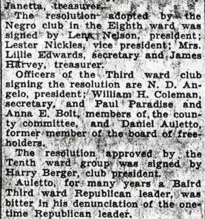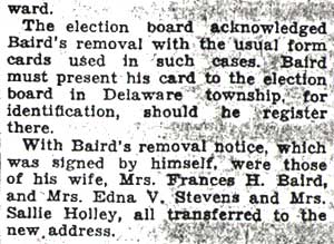 listen... Henry Aitken, No. 1 coal wagon chaser, tried to get Commissioner von Nieda on the bridge commission until Hoffman slipped Baird in...Has the Baird boom gone boom?...That suburban handbill publisher printed that the next time Surrogate Hanna runs for public office it'll be city commissioner instead of a county post because he is weak in the suburbs... The last time Frank Hanna ran, it was for State committee, and he ran ahead of his running mate in every county municipality. |