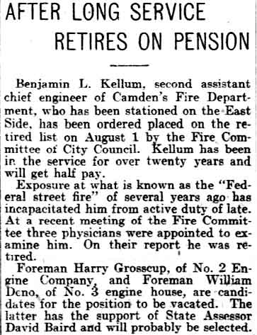 CHIEF’S REMAINS Not since the memorable funeral of Chief of Police Foster ten years ago, has there been such a genuine public tribute paid an official of Camden as was in evidence last night at the bier of the lamented Fire Chief Worthington, and today at his funeral. It is hard to estimate the number of persons in a crowd, but from 7 until 9 o’clock last night there was a steady stream of men, women and children, two abreast, who passed from the main entrance, through the center corridor and beneath the illuminated rotunda, where the body lay, and thence out by the west corridor. There was never a stop, and it is estimated that at least 10,000 persons were there, perhaps more. There could not have been a more ideal location for the repose of the casket containing the honored dead, and the great array of beautiful flowers than beneath the rotunda. It seemed to be a sacred shrine in itself where the citizenry dropped a tear for the lamented departed. The effulgence of the soft lights from above specially installed by Electrical Chief Kelly but lent to the scene and as the dark garbed escort of firemen, the active pall bearers, stood, on guard, the scene was unusually impressive. Chief Worthington, aside from the pallor that comes to the dead, looked as he did in life, for the thread had been snapped so quickly that it was while he was in his full vigor that the vital spark had taken its flight. There were some marks on his face that indicated the intense though momentary suffering through which he passed on his fateful plunge from the roof of the burning building to his quick death, and the passing crowd remarked this. But withal there was that calmness and repose feature which seemed to indicate that the gallant leader of Camden's fire fighters but lay sleeping rather than that his soul had taken its eternal flight. Public grief may be a mere ephemeral emotion, born of the moment and only to be succeeded by the acclaim of the newly arisen public idol, but last night's encomiums seemed to come from hearts that overflowed with genuine and permanent sorrow over the untimely passing of so excellent a public servant. Many tear-suffused eyes indicated this, many expressions of grief, of sorrow, of condolence of those left showed this. The sentiment in evidence everywhere can only be likened to the sweetness of the wonderful flowers whose odor spread thorough all the corridors and in all the rooms of the great marble building. High in the clock tower of the City Hall the bell began tolling at 6:30 o'clock. At half-minute intervals its doleful strains went forth on the cold blustery east wind which had succeeded at day of spring sunshine. The bell and the screeching wind seemed to combine as a knell indicating the passing grief of the city. It was the preliminaries to the marching of the funeral cortege from the stricken Chief's home on Penn Street to the resting place at the Court House. There were forty policemen in dress uniform with Chief Gravenor at their head. There were twenty-six fire heads from Philadelphia, with Chief William Murphy in the van, a tribute in itself of more than passing moment. There was the caisson on which was the black draped casket containing the body of he who all honored. There was the little red car in which Chief Worthington was wont to speed through the city at every alarm and there was his helmet and coat. There was Acting Chief Stockton and forty of the men who fought flames under the direction of he who lay so still. There as the family in cabs with curtains drawn, the members of City Council and the active pall bearers- Daniel Leach, Peter B. Carter, James White, William Patterson, Elmer Burkett, Samuel Harring. When the cortege reached the Court House the Camden boys took up their position on the inside beneath rotunda while the Philadelphia visitors made an imposing array on the granite steps outside. And then came the public in its steady and unending stream. Later the Philadelphia delegation was escorted to the Board of Freeholders room where tribute was paid to the dead and where a mingling of the two cities took place. Besides Chief Murphy the visitors included Battalion Chiefs William T. Barrett and George P. McConaghy, Captains L. F. Bunting, William Lindsey; H. Dinlocker, J. Higginson, J. E. Talbot, D. Campbell, T. O'Brien, F. Hughes, E. Basenfelder; H. Hutt, William McCusker, G. Rheim, R. Wilsey, J. Webb, H. Goers, H. Haines, Insurance Patrol Captain Joseph H. Shermer William Hickman, William Rodgers, John Wyatt, David Phillip, John Clyde, H. Wilkinson. President of City Council James E. Hewitt spoke of the work Chief Worthington had already accomplished, of his plans, of his value and worth to Camden. Chief Murphy responded in a fitting way and this incident in itself was one to be remembered. An affecting sight was witnessed by the handful of spectators, among them being other firemen, city and county officials and policemen who remained after the big doors on Sixth Street had been closed. The last to view the Chief's remains were a delegation of about twenty firemen. Solemnly the men passed by the bier and gazed upon the features of their departed brother. As the last of the line approached Deputy Chief John A. Stockton was seen. He stopped and with his cap laid across his breast be looked down into the casket. For almost a minute Chief Stockton stood as though glued to the spot. Then he glanced about him and the sympathetic look upon his face thrilled all. He heaved a sigh and perhaps the teardrops refused to come, but Chief Stockton, as the lines upon his face showed, was struggling with the inner man. His emotions were tugging at his heart, but a fire laddie cannot give way to his feelings although his brother superior officer and dear friend had answered his last alarm. The floral pieces surrounding the bier bespoke the love, admiration and respect the donors held for the dead chief. One design particularly beautiful was a mammoth loving