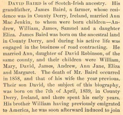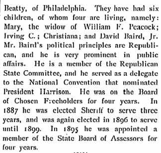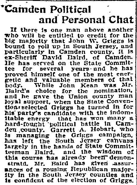 "Dave's all right," seems to be the general opinion, even when expressed in a more conservative but not less positive manner by Philadelphia's prominent business men, with several of whom I talked; his political associates also chime in promptly with the senti-ment, "Dave is a good man," Mr. Baird hails from the same town as Walt Whitman, and many other celebrated names come to mind in connection with the state, deepening the conviction that New Jersey is the right place for training and keeping the best men, whether in literature, politics, business, or billion dollar corporation. Mr. Baird is one of those men who never forget a friend, and when in later years 'he returned to Port Deposit his first care was to go in search of the farmer's wife, but the patron saint of Brick Meeting House had passed to a wider sphere of work. The grateful lad invited the bereaved farmer to come and see him in his prosperous days at $16 a month, and afterwards visited the Old Erick Meeting House to assure himself that the good farmer lacked nothing, for the successful young man never forgot those who had shown kindness to a homeless lad. It was probably his early experience which molded the opinions of David Baird and made him an ardent Republican for life. The hard times on the farm and the panic of 1857 taught him by bitter experience what the days of "ten-cent Jimmy Buchanan" meant to the working man, and made him in after years a consistent adherent of his party irrespective of his own business affairs. Those happy days on the Susquehanna River are still recalled by Mr. Baird; it is delightful to hear him tell of the swirling rapids, the rolling logs, the seething waters that are as fresh and forceful as that rich brogue, which he declares is "as good now as ever." As he talks, one almost sees the logs coming down the Pennsylvania primeval forests. It is easy to see that then as now he loved America and American institutions, and already promised to be what he has since become a type of those men who have created wealth and influence from the latent opportunity of a new country, and have used their acquisitions to help their fellowmen, rather than for personal aggrandizement. In 1859 Mr. Baird came to Camden, New Jersey, and his sincere loyalty to the firm for which he worked soon advanced him to the position of foreman, in which he had charge of rafting lumber on the Susquehanna and delivering it at Baltimore, Philadelphia, New York and New Haven. During the panic of 1873, when he felt that his employers were paying him a salary that he was not earning, he insisted on embarking in business for himself, with a capital of less than a thousand dollars, which represented his en-tire savings, and that is a story by itself. In 1868 David Baird married Christiana Beaty, an Irish lass; in 1873, when the hard times came it was his wife who had ready for use the savings that started Mr. Baird in business, and what a tribute he paid to her, who had stood by him in all the struggles of business and political life, always under-standing his purposes, and always inspiring him with the highest ideals and the brightest hopes. Never have I heard a more beautiful tribute paid in so few words, ai1d while he spoke I realized what a heavy loss the hus-band sustained in the death of such a wife. Despite the fact that he began business in the teeth of that panic, Mr. Baird began to make money, aided by his former employers who told the bank that "David was to have anything he wanted." In the years that followed the young man started in the busi-ness in which he had formerly been employed, and had the pleasure of hearing from the lips of his sometime' employers warm expressions of gratitude and appreciation, who were always ready with a "good word" for a loyal worker who has since become one of the richest men in the community in which he resides. Early in life the young Irishman showed a decided aptitude and liking for politics, and even before he had a vote he allied himself to the party and principles for which he has been a lifelong worker. After he- had entered into business he was asked to become a candidate for the Board of Chosen Freeholders of the County of Camden, in 1875. The matter was discussed in the humble, two-tenement home that had been provided by their own earnings, and it was the bright-eyed Irish wife who encouraged him to take up his duties as an American citizen. The young man called the attention of the lady of the home to the fact that "it cost money to be elected," for at that time" the bright metals" were somewhat scarce in that household. Mrs. Baird promptly went to a pillow that was her especial pride and from it took the savings that furnished funds for David Baird's first campaign. He was popular with "the boys," and when he made the fight it was to win, though in the beginning he was somewhat hard pushed. He was elected for four years and was a member of the Court House Committee during the time of his membership. Mr. Baird's activity in the interests of his party and loyalty to his friends soon became known throughout the state. He was interested in everything that concerned New Jersey and Camden County and helped. to build the Insane Asylum, in Blackwood, and the new county office building. He was nominated as sheriff of Camden County, after a bitter contest at the polls, where he was opposed by one Democratic candidate and two Republicans. Mr. Baird was the only Republican candidate elected in the county at that time. After an interim of two terms he was again nominated for sheriff for 1896 and was chosen at the same time that William McKinley was elected president. He enjoys the distinction of being the only man ever elected more than once for the office of sheriff in Camden County, and was also the only sheriff who was successful in having his deputies elected to succeed him, which is suggestive of Mr. Baird's loyalty to his associates. As a delegate to the National Republican Convention