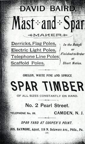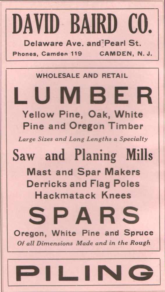 BA1RD, SPARS, TIMBER AND PILING, IN the important department of heavy timber for ships' spars and masts, for wharf building, and for all constructive work requiring massive girders, etc., the establishment of Mr. David Baird is one of the most prominent in Camden. Mr. Baird has been connected with this line of business for the past 30 years, and is therefore thoroughly practised and experienced in all its details. In 1873 he commenced the present firm, dealing in spars, heavy logs and timber, and piling, and now carries a stock which is the heaviest of this kind in the United States, and which is divided between the three cities, New York, Boston and Philadelphia. The yards and log-pens are located at Point and Pearl streets, having a large river frontage, and all the necessary conveniences, and the trade is one which may be said practically to extend to all parts of the country, the chief markets being New York City, New London, Boston, Mystic Bridge, Portland, Maine; Gloucester, Mass., and the East generally. The spars, which vary in length from 30 to 100 feet, and from 6 to 40 inches in diameter, are either floated in rafts or brought by vessels from the lumber districts of Pennsylvania, Nova Scotia, New York State, Michigan and California, and are secured in the log-pens until needed. Some are sold in the rough, and others dressed and finished for their destined purpose, the majority being made into spars of various dimensions for shipping. The business is a heavy one in all its details, employs very large capital and much labor, both skilled and unskilled, and is almost entirely wholesale. It is an essentially water-side and maritime industry, and one for which the city of Camden, with its fine river frontage, is particularly well adapted. In addition to his business in spars, Mr. Baird is also a considerable owner of vessel property, either owning entirely, or in part, a large number of sailing vessels and several tug-boats. He is an influential citizen of Camden, known and respected highly in all circles, especially in political life. He has held most of the prominent public municipal offices, and now sustains the responsible duty of Sheriff of Camden City and County. |