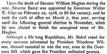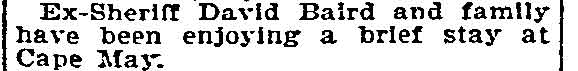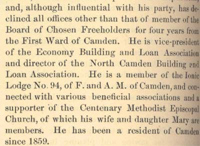 David Baird Sr. was one of Camden's leading citizens for well over 50 years. Born in Ireland in on April 7th of 1839, he came to America in 1858 after the death of his father, and settled in Camden the following year. After working in a Philadelphia lumber yard for 13 years, he opened his own business, the David Baird Company, in Camden in 1872 and became quite successful, with lumber operations in eight states and ship's spar yards in five different cities in the northeast. David Baird involved himself in politics, and served in a variety of capacities. He was a quite powerful figure in the Republican party which dominated Camden politics. A protege of Civil War hero, Congressional Medal of Honor winner, and United States Senator William Joyce Sewell, he secured contracts to supply poles to string the new telegraph, telephone and electrical lines in Camden and the surrounding area, and timber contracts during the Spanish-American War through Sewell's patronage. In return, David Baird ran the local Republican organization while Sewell served in Trenton and Washington. To say David Baird Sr. did quite well during these years would be an understatement. He acquired the home at 804 Cooper Street in the 1890s, the mansion built by real estate developer Edward N. Cohn in the late 1880s. The Baird family would make its home here until October of 1936, when his son David Baird Jr. left Camden for his farm in Delaware Township (present-day Cherry Hill). David Baird Sr. was the dominant figure in the Camden County Republican party after Sewell's death. At different times he served as a member of the Board of Chosen Freeholders, Camden County Sheriff, and sat on the New Jersey State Board of Assessors. An unsuccessful Senatorial candidate in 1910, he was appointed to the United States Senate in 1918 to fill the seat vacated by the death of Senator William Hughes, and won a special election in November of that year to serve the remaining two years of that term. He served on the Republican State Committee and was a delegate to the National Conventions in 1888, 1904, and 1916. After returning to Camden from his senatorial service in Washington DC, David Baird continued his involvement in local politics, and was instrumental in the acquisition of 225 Broadway, which served as Republican Party headquarters in Camden from 1923 until 1940. Besides his lumberyard, David Baird's business interests included a partnership with Joseph I. Morris of the Morris and Mathis Shipyard and Joseph Tway. The three founded the Tway Steel Forge, which later became the Camden Forge, on Mount Ephraim Avenue. This business provided most of the steel forging for the New York Shipbuilding yards during both World Wars. In 1916, David Baird Sr. was the President of the First National Bank of Camden, and on the Board of Directors of the Security Trust Company. On January 28, 1897 then Sheriff david baird sr. was one of several dignitaries who were in attendance at the opening of the Catholic Lyceum, attached to the the Church of the Immaculate Conception on Broadway at Market Street. Other attendees included the-New Jersey Governor John W. Griggs, Mayor john l. westcott, late Attorney-General Samuel H. Grey, Camden city solicitor j. willard morgan, Senator H. W. Johnson, then- Assemblymen Louis Derousse and Scovel, Postmaster Harry B. Paul, ex-Judge Armstrong, Architect Henry S. Dagit, J. J. Burleigh, George A. Frey, and H. L. Bonsall. The Lyceum would evolve into Camden Catholic High School. David Baird Sr.'s wife, Christianna Beatty Baird, was very involved with the founding and operation of the The Home for the Aged and Infirm of the Methodist Episcopal Church, which was originally at 531 York Street before its construction and opening in Collingswood in 1891. Mrs. Baird passed away on August 29, 1897. The Baird's daughter, Mrs. Mary Baird Fox, then took up her mother's role as President of the Board of Managers of the Home. David Baird Sr. served twice as Sheriff of Camden County, from 1887 to 1890 and from 1896 to 1898. While Sheriff in 1887 he appointed his cousin, David Logue to the position of turnkey of the Camden County jail, a post he held until 1906, when he was made warden, serving in that capacity until 1921. Another cousin, Joseph Logue, served from 1894 to 1920 as a firefighter with the Camden Fire Department. David Baird Sr. passed away at his home, 804 Cooper Street, Camden NJ on February 25, 1927. He was interred at Harleigh Cemetery. His surviving family members included his son David Baird Jr., who also served as a senatorial appointee from New Jersey, and was a dominant figure in South Jersey Republican politics for many years after his father's passing. |