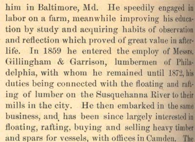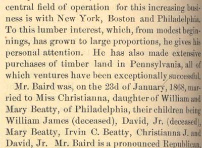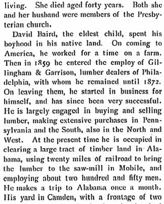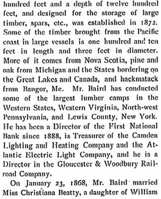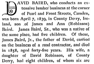 His promises, whether in business or politics, are always kept, no matter at what sacrifice to himself, and he evidently is one of the old-time men who "sweareth to his own hurt and changeth not." Hard work and fidelity to duty have been the. keynotes of his successful career. He is frank and self-sacrificing and does not hesitate to inconvenience himself to fulfill a promise to a humble friend. He candidly acknowledges a mistake, and is eager to make full return for any favor received; he says: "My heart was in· it; I would have felt an ingrate to do otherwise." Mr. Baird is a fine example of manhood, and has all the prowess of the raftsman; he is stocky and powerful in build, wears a heavy mustache, and has keen blue eyes; Mr. Baird has an emphatic way of bringing down his fist that emphasizes his conviction. He is peculiarly devoted to his family, and his affection is equaled by theirs for him. They believe absolutely in him, and when in former days his wife said: "You will beat him, Dave," there was not a dissentient voice all along the line. "I may have been wrong," he said, "but they were always with me." Mr. Baird has a beautiful home in Camden, but is one of those men who has never been envied because of his modest success- sharing it far and wide, doing good to all, and everyone is welcome to a share in his prosperity. Mrs. Baird was noted for her philanthropy and her warm-hearted way of helping others. In early days Mr. Baird won distinction in other lines than politics, he had the honor of towing the first raft of spars from New York to Boston; its value was $25,000 and the 'safe conduct of such a raft was con-sidered an impossible feat until achieved by the enterprising young Irishman. He also towed valuable rafts from Lake Michigan to Buffalo, through the Erie Canal, down the Hudson River to New York, and to Philadelphia, Baltimore and Norfolk. For many years Mr. Baird purchased spars and piling from Alger, Smith & Company, of Detroit, Michigan, and his business relations with, and tribute to General Alger aptly exemplify that "comrade" spirit which prevails in the lumber trade, in which the men are always ready to help each other during troublesome times, when the worth of friendship is tested. At such periods David Baird has always been a true friend. The enterprising man from Derry has also dealt in timber, lands, saw and planing mills in Pennsylvania, New York and the South, and knows the quality of timber as well as he does human nature. He seems instinctively to recognize sound wood and a good man and it is this insight which has created his fortune, combined with his doing and daring things that other men never attempted. His feats in raft transportation are well known in the lumber trade, and represent a saving of thousands of dollars, owing to the expert methods employed. Mr. Baird is active in commercial life and is interested in the financial institutions of his city, and in building associations, which have been in existence more than twenty-six years, and are the strongest and most successful in the southern part of the state. He is president of one of these societies. He succeeded John F. Starr, war congressman and former member of the district, as president of the First National Bank, which was established in 1855, and is located in a stately building of colonial design, surrounded by an iron fence, and standing in the center of the city. During his presidency the deposits have doubled. Mr. Baird is also director of the Security Trust Company of his home city, and is loved and revered by his fellow citizens in Camden- his home-where his "boys" and friends all agree "Dave is a real man." Some five years ago he purchased an extensive property in Camden at the foot of Pearl Street, where in 1859 he found his first employment in Camden; he has now on this site a large lumber, saw and planing mill and spar manufacturing business and has also an extensive spar making establishment in Brooklyn, New York. This enterprise is known as the David Baird Company and those interested are: Mr. Baird, his two sons, Irvine Baird and David Baird, Jr., bright active young men, and E. F. Van Stavoren who came into Mr. Baird's employ some twenty 'years ago. At all times there can be found at this plant some of the largest timbers and spars that are to be had in any section of the country. The large stock includes yellow pine from the South, white pine, fir and oak from various sections, in fact almost everything in the lumber or spar line is to be found in the large and varied stock. |