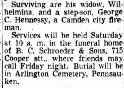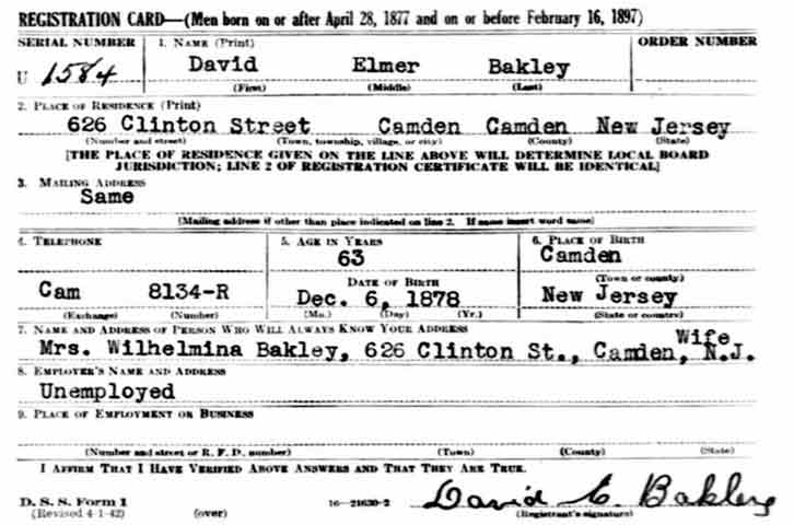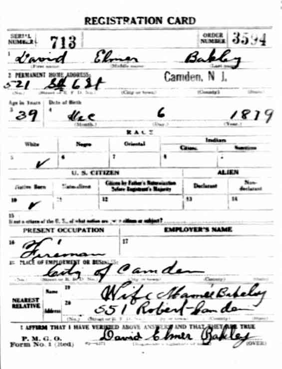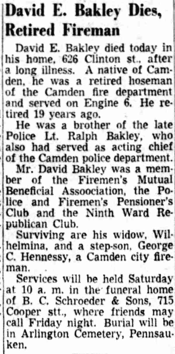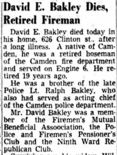 DAVID ELMER BAKLEY was born in New Jersey on December 6, 1878 to Clara and Ridgeway Bakley. He was the second of three sons, being born between Lewis and ralph bakley. the family was living on York Street just before he was born. They had moved to 213 North 9th Street by 1887, and by 1890 to 582 Pine Street. When the Census was taken in 1900 the family lived at 583 South 6th Street. The elder Bakley then worked as a day laborer. David Bakley married Mary Rushworth around 1903. When the census was taken in 1910 the Bakleys were living at 512 South 6th Street with Mary Bakley's father, John Rushworth. David Bakley was then working as a machine operator in a shoe factory. By the end of 1912 David Bakley had been appointed to the Camden Fire Department and was in time assigned to Engine Company 6, at Front and Linden Streets. By September of 1918 David Bakley and his wife had separated. He was living with his parents at 521 South 6th Street, and was still at that address when the census was taken in January of 1920. Brother Lewis Bakley lived next door at 523 South 6th Street. On November 12, 1928 David Bakley married the former Wilhelmina Minnie" Ley at Union Methodist Episcopal Church in Camden. She was the widow of George C. Hennessey Sr. After the wedding, David and Minnie Bakley and stepson George C. "Cal" Hennessey made their home at 626 Clinton Street. David Bakley retired from the Camden Fire Department in 1933. In April of 1947, step-son George C. Hennessey Jr. began service with the Camden Fire Department. David Bakley passed away on June 25, 1952 and was buried at Arlington Cemetery in Pennsauken, New Jersey. |