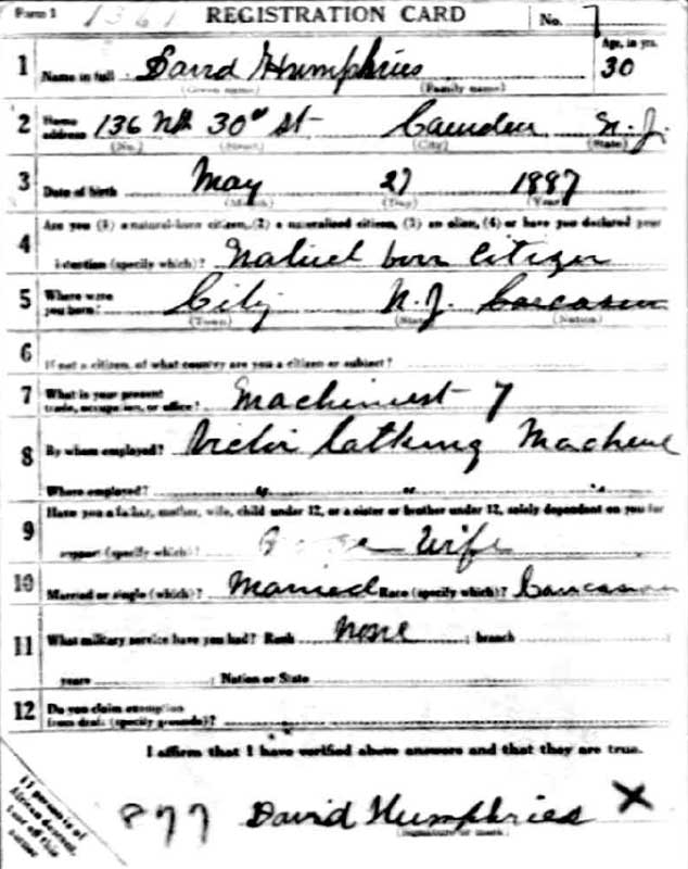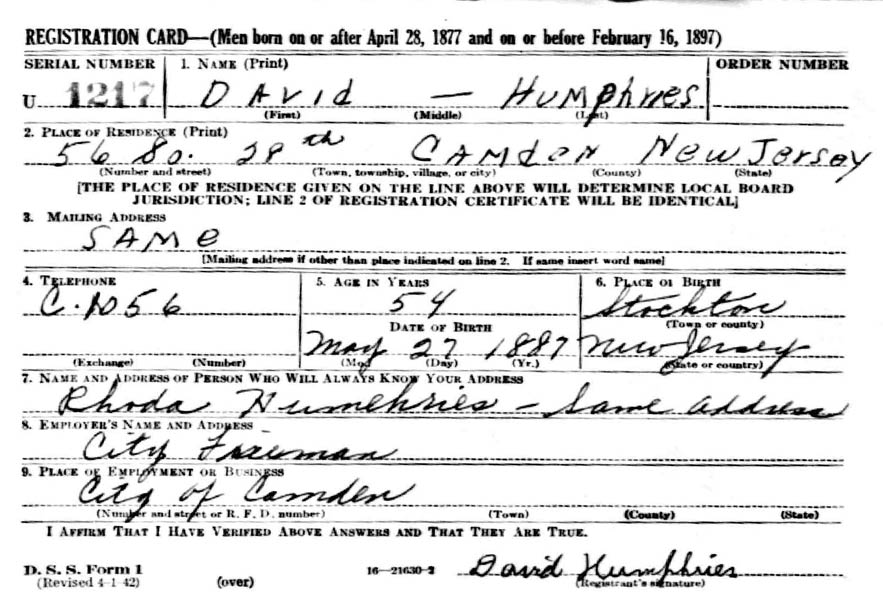 The family had moved to 56 South 28th Street when the 1940 Camden City Directory was compiled. When David Humphries registered for the draft in the spring of 1942, he and his family were still at 56 South 28th Street and he was still with the Fire Department. Shortly thereafter they moved again, to 14 Leonard Avenue. David Humphries appears to have left the Fire Department by 1943. He died on February 22, 1947. The Humphries' were still living at the Leonard Avenue address when the 1947 Directory was compiled, but apparently his son, David W. Humphries, moved to 208 North 35th Street shortly thereafter.