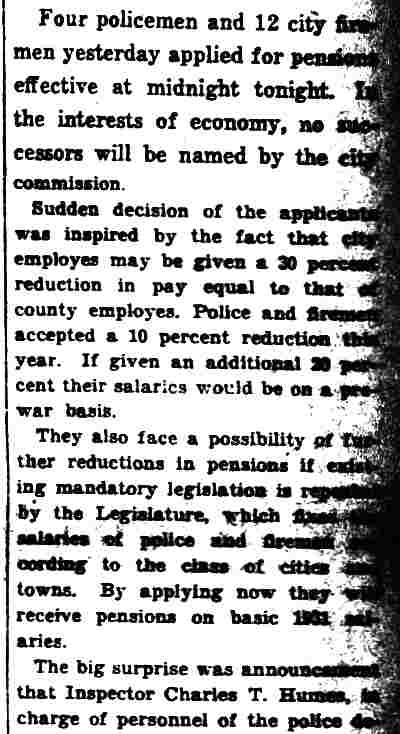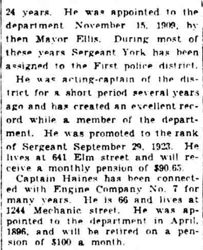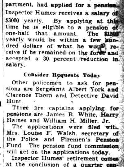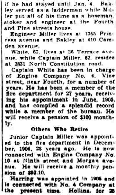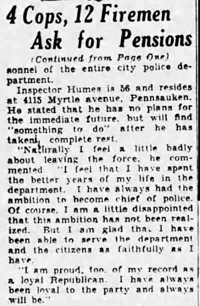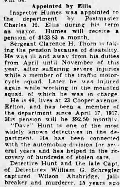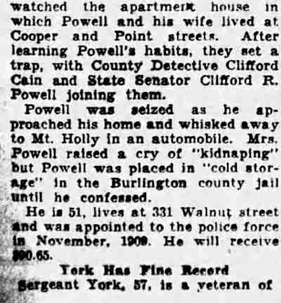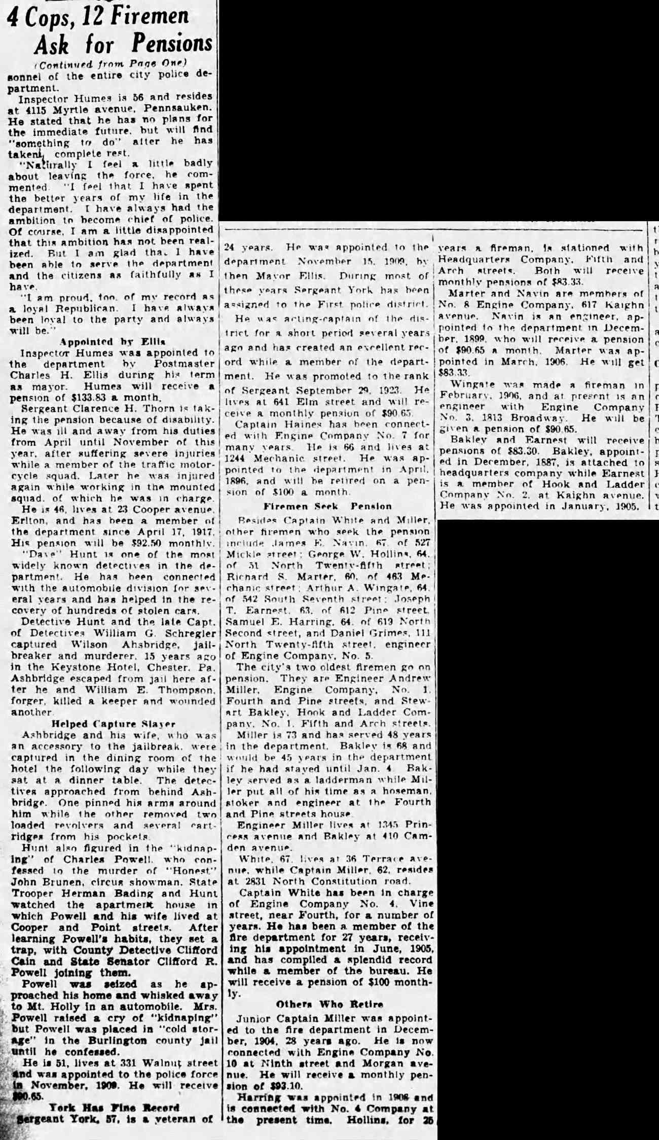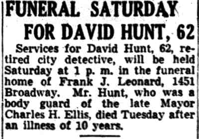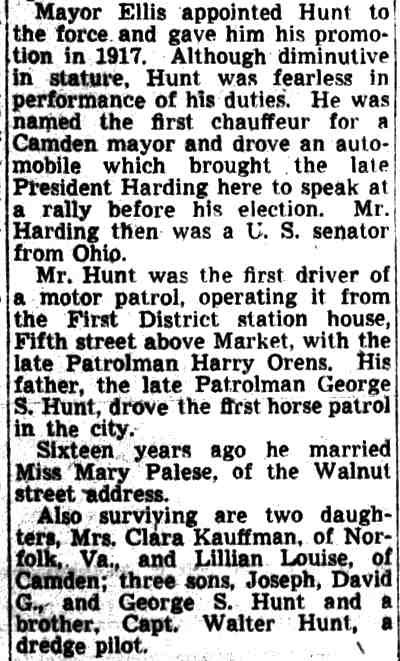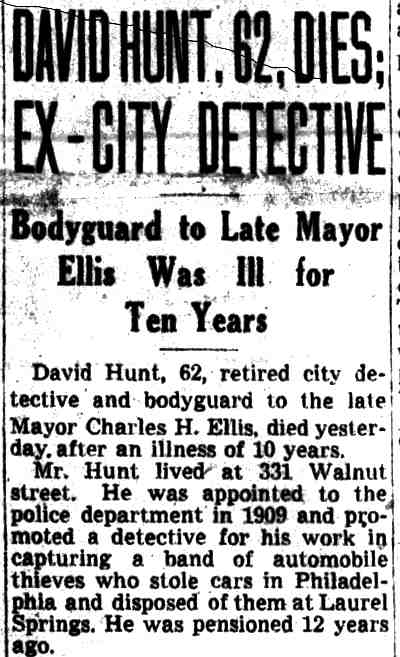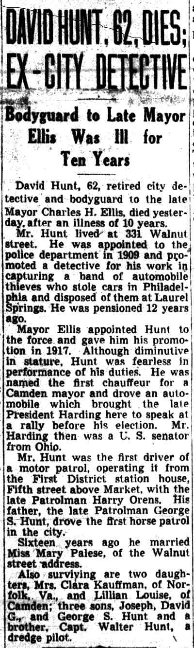 DAVID GARFIELD HUNT was born in Camden, New Jersey on August 11, 1881 to George S. Hunt and his wife, the former Clara Cook. George S. Hunt served with the Camden Fire Department in the late 1870s and 1880s, initially as the stoker and later as the hose cart driver with Engine Company 1. He later served as a member of the Camden Police Department. George S. Hunt's brother, James H. Hunt, also served with the Camden Fire Department and, being politically active, held a number of other positions. George S. Hunt married Clara Cook in the 1870s. There were three children, Walter, born in 1879; David, born in 1881; and John A.S. Hunt, born in May of 1884. The 1880 Census shows George S. Hunt, wife Clara, and son Walter at 814 South 4th Street. He was working as an oilcloth printer. The 1881 Camden City Directory shows him living at 411 Pine Street. By March of 1882 the Hunt family had moved to 441 Pine Street, Edmund Shaw was still living at 411 Pine Street. George S. Hunt moved back to 411 Pine Street by the end of 1882 and lived there as late as 1884. City Directories beginning in 1885 through 1888 show George S. Hunt living at 508 Pine Street, where he kept a saloon. The 1890 City Directory show George S. Hunt was living at 417 Pine Street, working as a driver for the Camden Police Department. He was still a policeman and living at 417 Pine Street when the 1892-1893 City Directory was compiled. George S. Hunt died of tuberculosis on August 26, 1892. The 1896 City Directory lists his widow, Clara, at 816 South 4th Street. Mrs. Hunt remarried in 1897. The 1900 Census shows her and her sons living with her husband, grocer Alexander M. Stone, and their infant son Charles W. Stone, at 740 Pine Street. He appears in the 1903 City Directory at 703 South 6th street, working as an oilcloth printer, a profession his father had on occasion followed. Directories from 1904 and 1905 have him at 554 Mount Vernon Street, and 1906 shows him at 564 Mount Vernon. The 1907 and 1908 Directories have him at 1016 and 1018 South 6th Street, respectively. Politically active, David Hunt was rewarded with employment, serving as Superintendent of the public bathhouse in 1908 and as night turnkey at the County jail in 1909. In November of 1909 he was appointed to the Camden Police Department along with Albert York. Their initial assignments were to the Police Department's ambulance crew, as both men drove. The 1910 Census shows David Hunt and his wife, the former Mamie Keating, whom he had married in 1901, and their daughter Clara were living at 613 Mount Vernon Street. The 1915 New Jersey Census shows them once again living at 554 Mount Vernon Street. Sadly, Mamie Hunt, only 26 years of age, died on May 11, 1911. The Hunts then had been residing at 568 Mount Vernon Street. When David Hunt registered for the draft he and his daughter were living with his sister at 1018 South 6th Street. David Hunt served as Mayor Ellis's driver for a number of years. He was promoted to Detective in 1917. He also drove future president Warren Harding when he visited Camden prior to his election in 1920. He had a long and distinguished career with the Camden Police Department. He took part in the arrest of escaped killer Wilson Ashbridge and was instrumental in breaking up a stolen car operation that stole cars in Philadelphia and got rid of them in Laurel Springs. Many of his other exploits will be in the future recounted in the newspaper articles below. David Hunt married Mary Palese in 1929. The marriage produced five children, Joseph Palese Hunt, David Garfield Hunt Jr., Lillian Hunt, Louise Hunt, and George Hunt. The family resided at 331 Walnut Street. David Hunt put his retirement papers on December 31, 1932. He died, after a long illness, on December 7, 1942, survived by his wife and all six of his children. As indicated above, David Hunt's father George S. Hunt and uncle James H. Hunt both served Camden as firemen and in law enforcement. David Hunt's brother, John Albert Stockton Hunt, was appointed to the Camden Fire Department in 1915. He had reached the rank of Captain, and was still working when the Census was taken in April of 1930. Sadly, Captain Hunt passed away in May of 1930, and was buried at New Camden Cemetery. David Hunt's brother, Captain Walter Hunt, worked on the Delaware River as a dredge pilot. Of his uncle James H. Hunt's children, at least three played significant roles in Camden. Sons George H. Hunt and Eli Morgan Hunt were career members of the Camden Fire Department, while daughter Theodosia Hunt Conaghy served as the matron [warden of female prisoners - PMC] of the Camden County Jail for 27 years. Her son, Eli E. Conaghy, boxes professionally for a time and was well known in South Camden. |