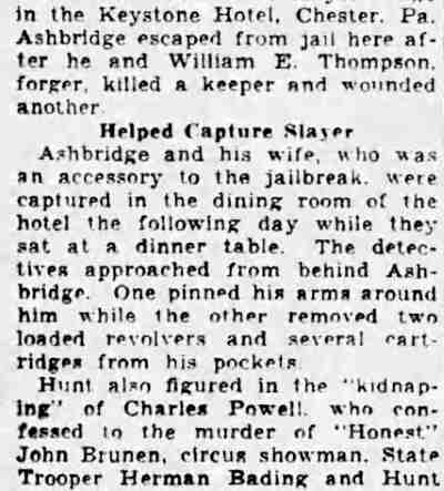 EXTRA ASHBRIDGE CAUGHT IN CHESTER HOTEL ALONG WITH WIFE Fugitive Murderer Waives Extradition and Detective Schregler Brings Couple to Camden in Motor Car PAIR REGISTERED IN EARLY MORNING Captured at noon with his wife in the Keystone Hotel at Chester PA, Wilson Ashbridge, who escaped from the County Prison last night with George E. Thompson, a forger, after killing Jailor Hibbs and shooting Jailor Ellis, is again in the County Jail. Ashbridge admits that he shot both men. He said the gun was given to him by Thompson. The coupe were captured in their room at the Keystone Hotel by Captain of Detectives Schregler and Policeman david hunt, who hurried to Chester in Chief Gravenor's automobile in receipt of a message that a man answering to the description if the published picture of Ashbridge registered there early this morning with a woman as his wife. Ashbridge offered no resistance when the officers entered his room. He waived extradition and being handcuffed was placed in the machine with his wife and hurried to this city. Schregler sat in the rear of the machine between Ashbridge and his wife. They reached City Hall at 2:10 o'clock this afternoon. Ashbridge was smoking a cigarette and looked sullen. When the murderer saw a battery of photographers getting ready to take their pictures, Ashbridge shielded his wife's face with his hat and hid his own face as best he could in his handcuffed condition. They were taken upstairs to the Chief's office and later sent to the Prosecutor's office. Ashbridge takes blame for the double shooting, but insists that his wife did not give him the gun, saying that Thompson supplied the weapon. The police knew last night that Mrs. Ashbridge was with her husband or intended to go with him. This information came in a letter turned over to the police by a Mrs. Dick, of East Camden, who was carting for the children. The envelope cautioned her not to open the letter until 7:00 o'clock last night. Mrs. Ashbridge said in the note that she was going to do a rash act and might not see the children again. In the cell occupied by Thompson the following note was found by Detective Painter. "Ashbridge has made up his mind to leave this place. I have decided to go with him. "It may seem like suicide and if anything happens send my body to the University of Pennsylvania" "THOMPSON" Seventeen loaded cartridges were also found in the cell. The detectives and their prisoners were accompanied to Camden by E.S. Fry, proprietor of the Chester hotel, where the couple were caught. There is no question but that Mrs. Ashbridge knew all bout the plan to escape. Where she met her husband has not been discovered. A reward of $1,000- $500 for each- was today offered by the Prosecutor. |
