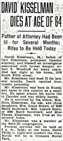 DAVID KISSELMAN was born in Russia in 1876. He came to Camden as a small boy. Employed for many years as an investigator for prominent attorney and one-time Republican State Assemblyman Albert S. Woodruff, David Kisselman made his home for many years at 1019 South 5th Street in South Camden, with his wife Dora. The Kisselmans had four children, a son, Carl, and three daughters, Grace, Lenore, and Theresa. Carl Kisselman became a prominent attorney in the 1930s and 1940s. David Kisselman died on December 3, 1940. A member of Congregation Beth El on Park Boulevard at Belleview Avenue, he was buried at Crescent Burioal Park in Pennsauken after services were held at his home. Rabbi Philip Lipis of Beth El conducted the funeral. |