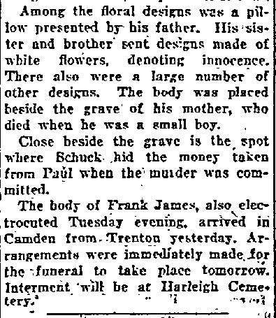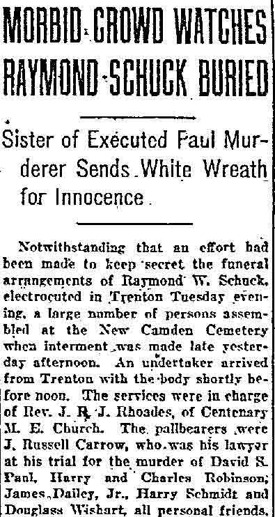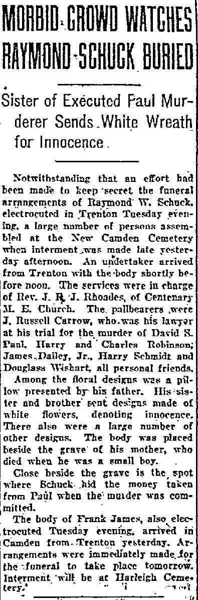 Harry Paul, of Mount Holly, son of David S. Paul, the murdered bank runner, of Camden, had been in attendance at the trial of Raymond Shuck, one of the murderers of the elder Paul, in Camden, when he was interviewed by a newspaper reporter on Monday. Here is what he said after stating that his mother has been in failing physical condition ever since the tragedy, and that he feared she would die as the result of her grief and the shock of the crime. "No matter what happens to these men- Schuck and James- it will not bring my father back to me. "I feel terribly sorry for the families of James and Shuck. No one has any idea of my sympathy for them. "But as for the men themselves, their conscience must be racked by the knowledge that their days seem to be numbered, and their end will be the electric chair. I cannot say I want to see them die as murderers. I cannot move myself to voice such an expression. "I cling to the belief, however, that if they do escape the death penalty, it would be a horrid example for other men with evil in their minds." It took the jury at Camden yesterday less than an hour to return a verdict of first degree murder against Raymond W. Shuck for his part in the murder of David S. Paul. The defendant had been subjected to a grueling cross-examination lasting nearly ten hours in all, by Prosecutor Wolverton, said to have been the longest line of interrogation of a murder defendant ever pursued in a trial in New Jersey. Shuck claimed that he was not a party to the actual murder but was compelled to drive the murder car and help dispose of the body of the victim at Irick's Crossing, near Tabernacle, this county, under threats of death by Frank James, already convicted of murder in the first degree and awaiting the sentence that will send him the electric chair. There was marked feeling between the two accused men when James appeared as a witness for the State. He made no effort to escape his own responsibility for the crime but stoutly maintained that Shuck had assisted in planning the crime and was equally guilty with him. Large crowds witnessed every session of the long trial which lasted all of last week and over into this, being concluded yesterday afternoon after the noon recess. It was evident that J. Russell Carrow, counsel for the prisoner, was fighting to save his client from the chair and that life imprisonment would be a welcome alternative. Even some of those who had worked on the case for the State were not sure that Shuck would be called upon to pay the extreme penalty for his complicity in the foul murder. A recommendation for mercy, included in the jury's verdict of first degree murder would under the law have required the court to pass a sentence of life imprisonment instead of capital punishment. Strangely enough, this bill was introduced and sponsored by Prosecutor Wolverton, when he was a member of the House Assembly some years ago. Shuck's wife stood by her dissolute husband throughout his trying ordeal and aided him in every way in his fight for life. She was evidently on the verge of collapse during the closing hours and when called to the stand fainted before she had been under the Prosecutor's questioning more then two or three minutes. She was not called back, nor was she in the court room when her faithless husband was pronounced equally guilty of the murder of Paul and started on his way to the death chair. He will be sentenced on a date to be fixed later by the court. |