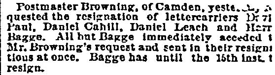 Frank J. James who some time ago was convicted of Paul's murder, was brought before the court in Camden and informed that he would be sentenced on February 25, at 3 o'clock in the afternoon. He was to have been sentenced Monday, but owing to the Shuck trial being delayed the date was advanced. |