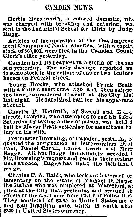 DAVID SILVERS PAUL was born in Pennsylvania around May of 1863 to David R. Paul and his wife, the former Sarah Hulings. There was one younger sister, Sarah "Saddie" Paul. The Paul family came more or less en masse to Camden. In the 1880s his uncle, Harry B. Paul, became politically active and served as Postmaster during the administrations of Presidents Grove Cleveland and William McKinley. Interestingly enough, David S. Paul had worked as a letter carrier in the 1880s, prior to his uncle's appointment in 1894. David S. Paul married Laura Ida Norcross. This marriage produced two children, Harry C. Paul in April of 1883 and on August 22, 1885, Eva Norcross Paul. The 1887-1888 Camden City Directory shows David S. Paul working as a letter carrier and living at 545 West Street in South Camden. The following year's edition shows him at 432 Clinton Street. Interestingly enough, seven years after leaving the postal service, David S. Paul and several other Camden letter carriers received settlements from the government to compensate them for overtime work while mailmen. The other Camden mailmen included Daniel W. Leach and Samuel C. Curriden, among others. The story was reported in the Philadelphia Inquirer on December 14, 1896. By the time the 1900 Census was enumerated, David S. Paul and family had moved to 764 Line Street, where they would live for many years. When the Census was taken in 1900 David S. Paul was working as a clerk and as an installment collector. By 1906 he was working as a painter, a trade he would follow through at least 1914. In that year's City Directory the Paul family was still living at 764 Line Street. By 1920, with his children grown and on their own, David and Laura Paul rented a small house at 612 Newton Avenue, around the corner from their former quarters on Line Street. This would be David Paul's residence until his untimely death. David Paul he was well liked and respected. He was hired by the Broadway Trust Bank to work as a bank messenger, carrying large sums of cash and securities between his The Broadway Trust and other banks and institutions in Camden and Philadelphia. He was working in this capacity when in October of 1920, when he was accosted by two robbers, Raymond Schuck and Frank James, who kidnapped, robbed, and murdered him, concealing his body near Irick's Crossing, a remote spot near Tabernacle in the New Jersey Pine Barrens. David Paul's remains were found by a party of hunters. His killers were arrested, tried, and executed in New Jersey's electric chair on August 30, 1921 |