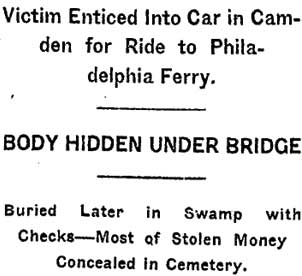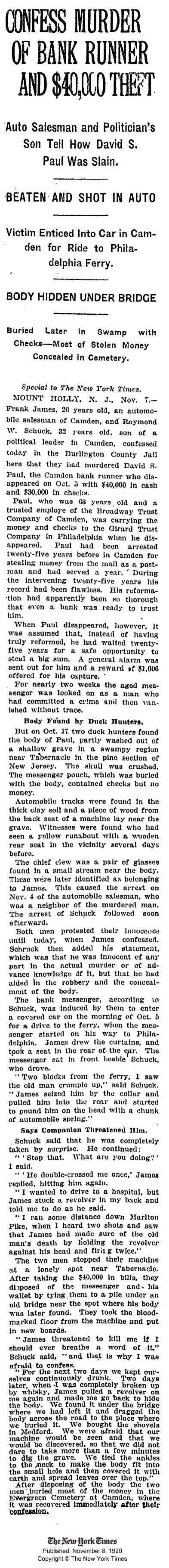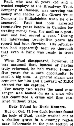 Hacked Remains of David Paul, Missing Bank Messenger, Discovered by Gunners. The Authorities of Burlington county have another baffling murder mystery to solve. On Saturday four duck hunters, William and James Cutts, and C.B. Inston, of Tabernacle, and George W. Duncan, of Audubon were passing through the pine forest at Irick's Crossing, near Tabernacle, when their attention was attracted by an automobile track following an old and rarely used trail leading to a stream toward which the gunners were making. As the car was miles off the nearest traveled road the tracks aroused the curiosity of the men and they followed them. In a short time they came upon a freshly made mound over which dead leaves had been thrown. Leading to the mound from the shallow stream nearby were tracks of men and also marks as though some heavy object has been dragged by the men making the tracks. Thinking perhaps that a deer had been shot and secreted there, one or two of the men scratched around the end of the mound with sticks and within six inches of the surface a human foot was unearthed. This put an unexpected phase upon the situation and the gunners decided to let Sheriff Haines continue the investigation. Word was hastily phoned to the jail at Mount Holly and the Sheriff and Detective Parker lost no time in reaching the scene of the tragic discovery. The new-made and crude grave was then opened under the Sheriff's direction. The body proved to be that of a man, fully dressed except for his coat which was lying buried deeper and under the body. The feet were tied with a heavy rope such as is used in towing automobiles and they were resting upward and back over the dead man's head. As soon as the features were uncovered Sheriff Haines recognized the dead man as David S. Paul, of Camden, a bank runner, who had been reported missing by the Broadway Trust Company of Camden ten days before, with $65,000 in cash and liberty bonds and $12,500 in checks besides a number of cancelled checks. The body was badly mutilated and it was evident that a brutal murder had been committed. Apparently Paul had been dead but a few hours and the remains were in a good state of preservation when discovered by the merest chance by the gunning party. There was a deep gash on the head as though made by a axe or hatchet, and the forehead was crushed in. Another ghastly wound just above one ear, alone was sufficient to have caused almost instant death. Every indication pointed to the man having been killed and buried within twenty-four hours of the discovery of the crime. The rigor of death had not yet set in and the victim's face appeared to have been freshly shaven. The marks on the ground accompanying the feet tracks leading from the stream about a hundred feet away, were quickly explained when the body was unearthed. Evidently those who brought the body to the unfrequented spot had attempted to secret it in the stream, but finding the water too shallow to conceal the corpse, they had dragged it out again by the rope which bound the feet and pulled it to the spot where the grave was quickly made and the body of the unfortunate man shoved into it. The clothes which Paul wore bore every evidence of being new. The shoes also had evidently just been purchased and the soles bore no evidence of wear. A search of the body failed to reveal any of the cash which the bank messenger is alleged to have taken when he so suddenly dropped out of sight while on his way across the ferry to go to a bank in Philadelphia to take the money, securities and checks for his employers. Only one cent was found in the pockets of the dead man. In the coat was a bundle of checks, said to have been cancelled. There had been no attempt to conceal the identity of the dead man. His watch which had stopped at 9:37, was found in his pocket and a stickpin and in his tie and (as written) a pair of sleeve buttons remained in the cuffs. How the dead man came to his untimely end and how his body happened to be buried in the far away spot in the pines miles from any human habitation, was a mystery when the body was first discovered and it seems to be as much so today, although the authorities here, as well as those of Camden and Philadelphia, are exerting every effort to run down the criminals. It will be recalled that Paul, who was 59 years of age , enjoyed the confidence of the bank officials by whom he had been employed for many years. He was a recent visitor in Mount Holly where he had a son, Harry Paul, and other relatives. On the morning of October 5 Paul started across the river to Philadelphia in company with another bank employee with a satchel said immediately afterward to contain $10,000 in cash and $12,500 in checks. This statement has since been revised and the amount of cash and Liberty Bonds that Paul carried is now variously stated to have been from $45,000 to $65,000. Upon reaching the other bank the other employee became separated from Paul whether by accident or through Paul's design is not yet known and after an attempt to find him at the ferry house, he went at once to the bank and reported his companion's disappearance. The Central Trust Company was immediately notified and after all efforts to get in touch with the missing messenger had failed the Camden and Philadelphia police were asked to locate Paul. Nothing more was seen or heard of him until his hacked body was discovered in the pines near Tabernacle ten days after his disappearance. What the missing bank runner did during the interim, where he spent his time or with whom he associated while the police of the county were searching for him has not yet been learned but it is expected that the mystery will be solved before long. One clue which seemed to put under suspicion the occupants of a yellow car turned out to be valueless when the owner, hearing of the authorities suspicions, came forward, gave his address as Haddonfield and proved that he drove a party in his yellow car inspecting some real