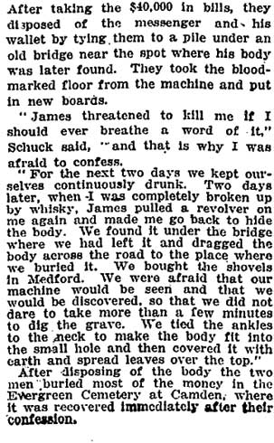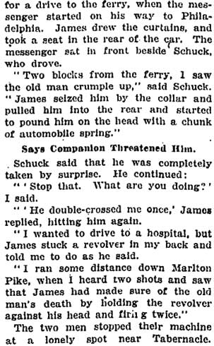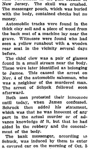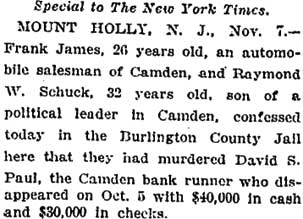 It took the jury only twenty minutes to find Frank J. James guilty of the murder of David S. Paul, at he conclusion of the sensational trial in Camden on Monday night. The verdict carried with it the infliction of the death penalty upon the self-confessed slayer of the bank messenger, the jury refusing the appeal of the prisoner's counsel to exercise clemency and recommend life imprisonment instead of capital punishment. The verdict came at the end of the five-day trial, during which the defendant's oral and written confessions were admitted in evidence in the face of counsel's strenuous objection. Dapper and apparently self-possessed, James entered upon his ordeal last Wednesday but as the trial wore on and damning evidence piled up against him his confidence petered out and several times he collapsed, once having to be taken from the court room in order to allow him to regain his composure. The Camden court house was besieged by a great crowd which clamored for admission to the court room in which the trial was held but the greater number of curiosity seekers were turned away. James offered insanity in his own defense but the evidence sought to be introduced to show that insanity existed in James' family was ruled out and after this failure the insanity defense was virtually abandoned, lawyer Harris admitting to the court during his argument that acquittal would not be asked on the ground of the prisoner's mental irresponsibility. Emphasis was made of the jury's right to find the prisoner guilty of first degree murder with a recommendation to life imprisonment instead of simply finding him guilty of first degree murder, which without the recommendation mentioned carries with it death by the electric chair. A stirring appeal was made by lawyer Harris to the sympathy of the jury and the counsel was visibly affected by his own feelings as he spoke. He had known James from boyhood and his appeal for clemency evidently came from the heart. At the conclusion of argument Supreme Court Justice Katzenbach delivered his charge to the jury in part as follows: "It now becomes your duty to render a verdict on the question of the guilt of Frank J. James. You must be governed by the evidence; in determining questions of fact sole responsibility is upon you. Any comment I may make on the evidence is only to aid you. If there be in your minds a reasonable doubt you must acquit the defendant. 'Reasonable doubt' however, is not a 'possible doubt', because everything in human affairs is open to possible or imaginary doubt. "You will therefore, be justified in assuming that a criminal homicide was committed. The law provides that all murders committed in attempting to commit a robbery shall be of the first degree. You have three choices-of declaring James not guilty, of rendering a verdict of murder in the first degree with no recommendations, or of rendering a verdict of murder in the first degree with recommendations that he be sentenced to life imprisonment at hard labor, and under the law I must be guided by your recommendation if so made." The jury was then sent from the court room and a recess was taken. This was at 4 o'clock. Upon resuming, an hour and a half later, the jury was summoned, it having been announced to the court that a verdict had been reached. When the foreman spoke for the twelve men composing the jury there was a tense stillness in the crowded court room. James seemed to be the most self-possessed of any of the principals in the trial. He presented a picture of composure although the grim set of his jaw indicated the great mental stress under which he was laboring. When the verdict of guilty of murder in the first degree was announced many of those in the room were visibly affected by the words which meant death to the accused man but James, who had almost miraculously recovered his nerve after the break-down during the early stages of the trial, was unmoved. As he was led away to his cell he turned and cast a searching glance over the crowded court room, looking for his relatives but they were not there, having anticipated what the verdict would be and wishing to avoid any more distressing scenes. As he passed out of the court room, to which he will be returned for sentence to the electric chair, James said to the officer who had him in charge, "It is no more than I expected." Counsel for the defense at once filed application for a new trial, and was given ten days in which to file his reasons. It is understood that his appeal will be based on three exceptions to the rulings of Justice Katzenbach. The crime for which James is believed to be certain to pay the death penalty, was one of the most brutal in the criminal annals of Camden County. According to James's confession he conspired with Raymond Schuck to decoy the bank messenger with whom they were both on friendly terms, into an automobile, while Paul was on his way from his place of employment to another financial institution with a large sum of money for the latter. Accordingly they timed their movements so that they met paul soon after he had left the Central Trust Company on Broadway, and offered to take him to the Camden ferry. When they had entered the almost deserted driveway which parallels the iron shed on Market street leading to the ferry house, James struck Paul from the rear with a heavy piece of automobile spring, repeated blows rendering him unconscious. Paul was pulled back into the rear part of the car and Schuck it is claimed, at James's direction, started out of the city. On the way Paul partly recovered consciousness and pleaded for his life but James again struck him and later fired two shots into his victim's head with the latter's own revolver. The flight of the murderers with their victim's body then led them over into Burlington County. They kept going until they reached a lonely spot at Irick's Crossing near Tabernacle where they pulled the dead man out of the car and tying his feet threw the body into