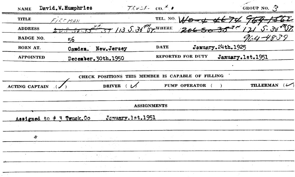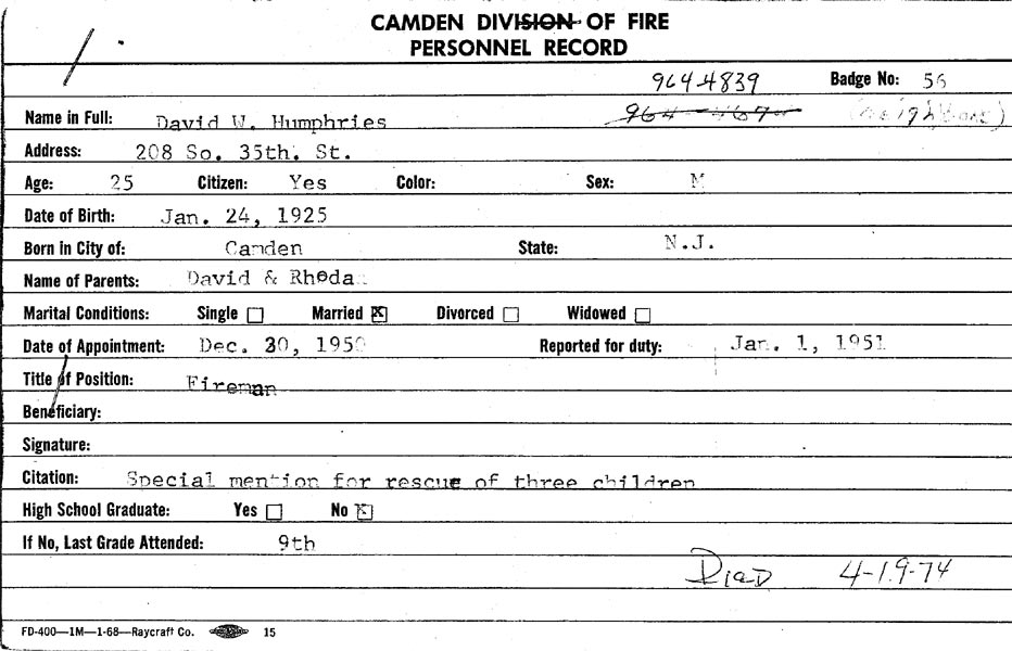 DAVID W. HUMPHRIES was born on January 24, 1925, the only child of David and Rhoda Humphries. His father had been born in Stockton prior to the 1899 merger with Camden, and like his father David Humphries lived all his days out in East Camden. His father was a veteran of World War I and a member of the Camden Fire Department. When the 1924 and 1929 City Directories were compiled, the David Humphries family lived at 2925 High Street, and they were still at that address in April of 1930. During these years their neighbors included a brother fire fighter, Harry J. Allebach, who lived at 2931 High Street. The family had moved to 56 South 28th Street when the 1940 Camden City Directory was compiled. When David Humphries registered for the draft in the spring of 1942, he and his family were still at 56 South 28th Street and he was still with the Fire Department. Shortly thereafter they |