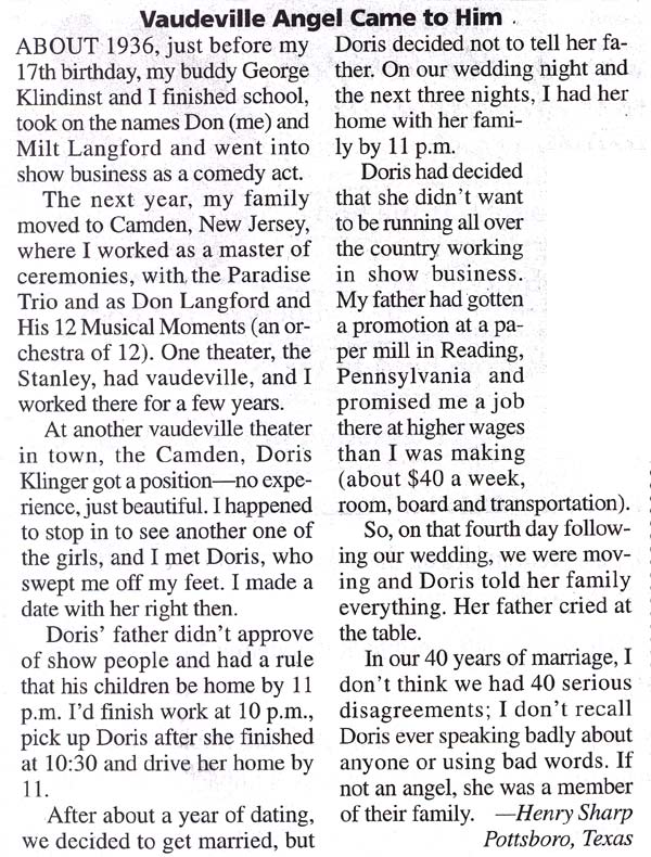 DON LANGFORD, whose real name was Henry Sharp, worked at the Stanley Theater in Camden as Master of Ceremonies in the 1940s. He also led a combo called the Paradise Trio and a twelve-piece orchestra known as Don Langford and His 12 Musical Moments. After marrying Doris Klinger he left show business and moved to Reading, Pennsyalvania, and later to Texas. |