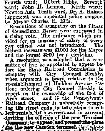 A. Haines Lippincott Daniel Bromley - South 10th Street - A.C. McCausland David M. Chambers - Cooper Street Benjamin Eppinger - Federal Street - North 12th Street |