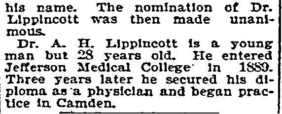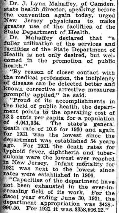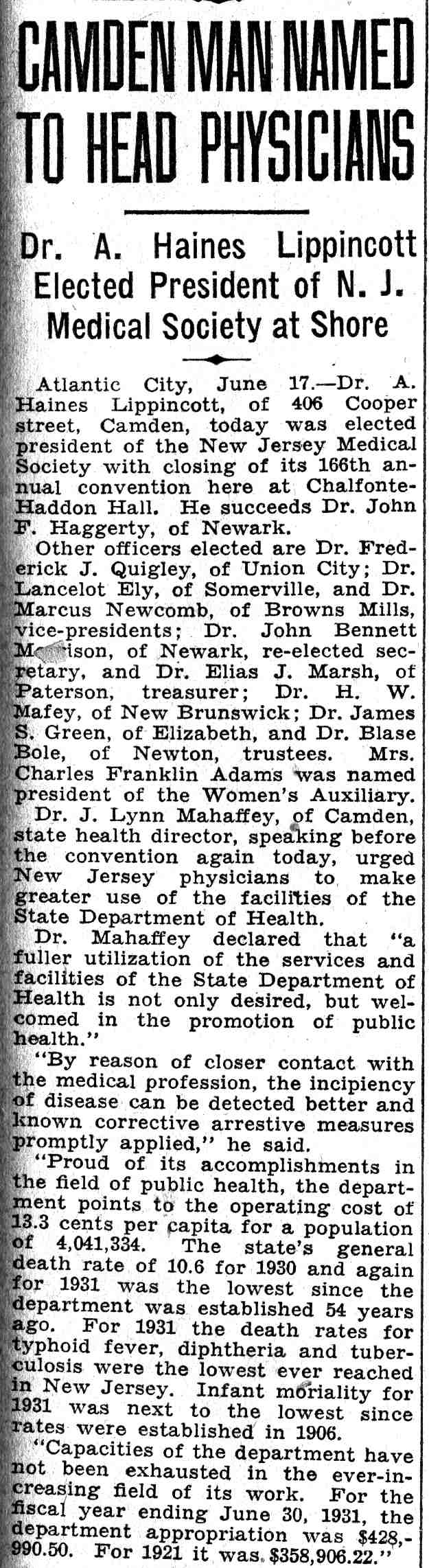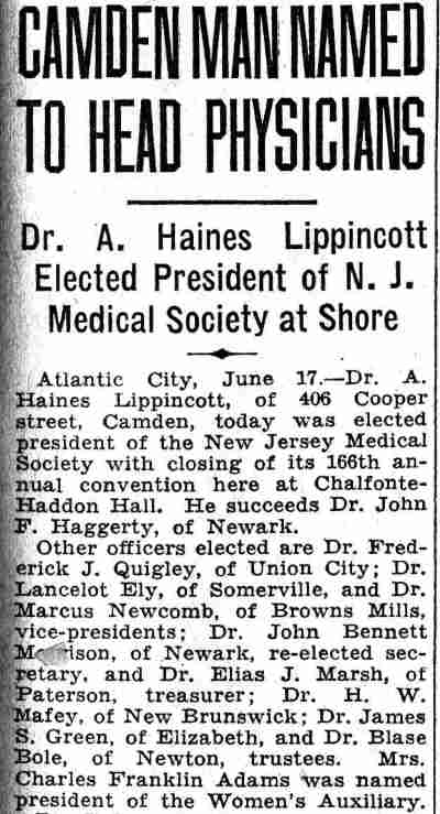 Lippincott Denounces 'Quack' Medical Broadcasts; Atlantic City, June 7.- An assault on "quack" medical advice broadcast by radio was made today by Dr. A. Haines Lippincott, of Camden, who retired as president of the Medical Society of New Jersey. The society is holding its 167th annual meeting at the Cha1fonte-Haddon Hall. He was succeeded by Dr. Frederick J. Quigley, of Union City. Other officers elected were; Dr. Marcus W. Newcomb, of Browns Mills, and Dr. Francis R. Haussling, of Newark, vice presidents; Dr. J. Bennett Morrison, of Newark, secretary, and Dr. Edward J. Marsh, of Paterson, treasurer. Calls Code Their Guide "The code of the profession has been our guide during the past year and the road is strewn with the corpses of men who have given their lives for the further advancement and protection of the professions," said Dr. Lippincott. "Medical advancement has been greater in the last quarter-century than in any other field of endeavor. When things crash about our heads and calamities in business reach tragic proportions, the profession has gone on its way unmindful of material things. "Medicine gives a sense of security unequaled by any other profession. Despite opposition, we have fought to safeguard the health of the state. I recommend that we censor 'quack' medical radio programs so that the nauseating after effects could be cur-tailed. I request the society to take action to meet this challenge." In speaking of the work done by the legislative committee, he told of the attempt to put through the Legislature laws in reference to control for those desiring to specialize in certain branches. "It is not for the politicians to decide but for the profession," he said in lauding the committee for defeating the bills which, he declared, were inadequate. The committee on education, he re-called, drew up plans for satisfactory substitute legislation. , New Yorker Speaks The principal address tonight was made by Dr. William H. Ross, for-mer president of the New York StateĀ· Medical Society, who discussed the profession's economic problems. "Medicine has a product the world needs and part of the world cannot get enough of it because they can-not pay for it," he said. "The whirl of theory of how to correct the economic depression of commerce and industry and the e f- forts of the government to get out of the grip of post-war forces influ-ence payment of medical service. But of all problems facing the profession, we have only to deal with the problems of caring for the indigent and the large group of people near the relief class. "The social function of medicine is more closely related to the social state of the people than ever before. The relation of medicine have come into bold relief in recent years, because of the growing health con-sciousness of the public and the changing attitude of society towards its responsibility for medical service and care for people who cannot afford to obtain it. "The conservatism of medicine has kept the profession from fully grasping the tremendous effect of what is going on, and, their effect upon the service of the most vital necessity in the whole world. Medicine is faced by a great problem and the mass of us do not know it. Public Is Confident "Medicine still has the confidence of the public. If we can hold it through this crisis, the profession will be the most supreme social influence in the whole world. "The services of medicine must be distributed by methods under the control of the profession itself. The public has awakened to the cost of medical care. It has passed beyond placing the responsibility on the physician, but is looking to them for a plan to meet the problem. "Change the professional principals of earlier days into a scheme for paying the physician, which is in accord with the modern conditions under which he has to work. When the swirl of speculation and, theory subsides, we will again remain the great social factor and will influence civilization as it has always done." . |