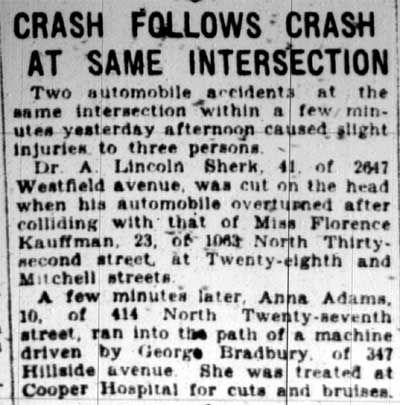 Policeman James Banks made the arrest after Benjamin's car struck and overturned the machine of C.R. Finney, 62, of 201 Cooper Street. Finney was treated by Dr. A. Lincoln Sherk. Benjamin was ordered to appear before Judge Garfield Pancoast June 29.