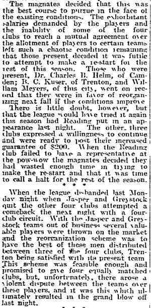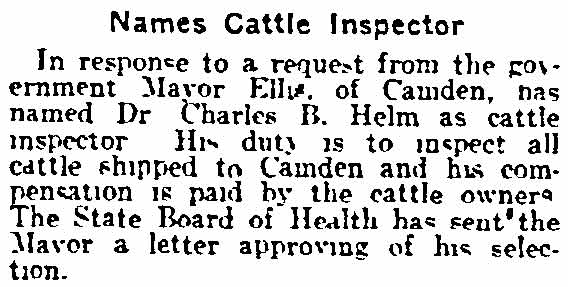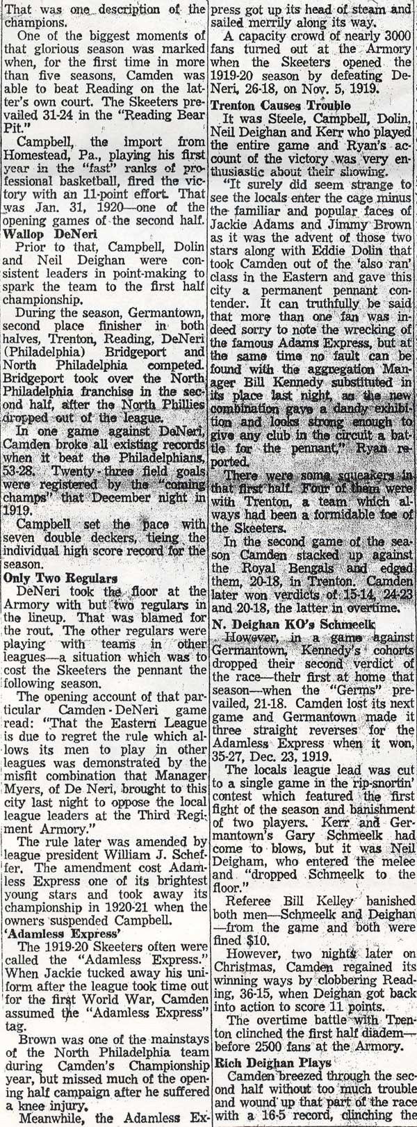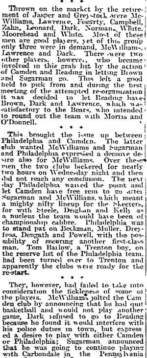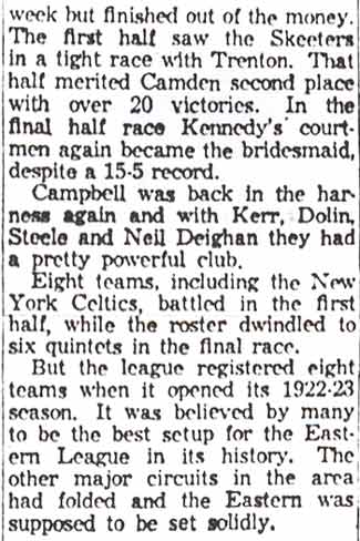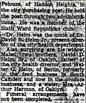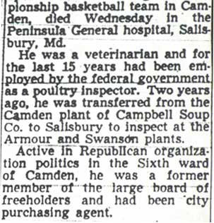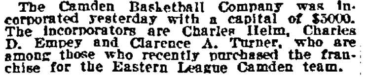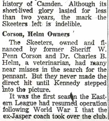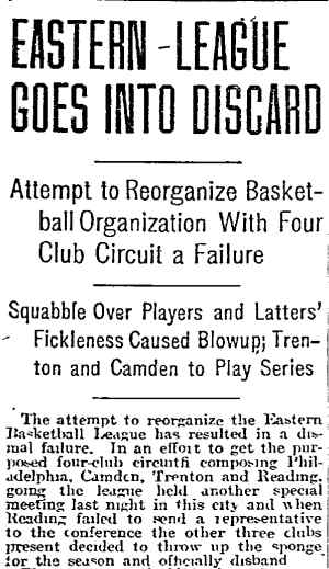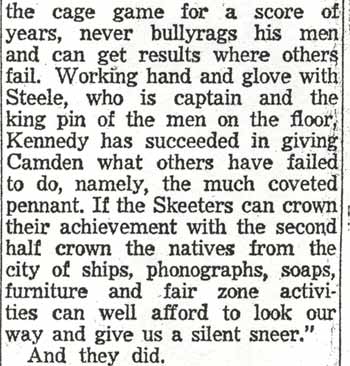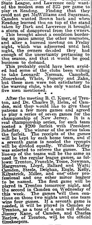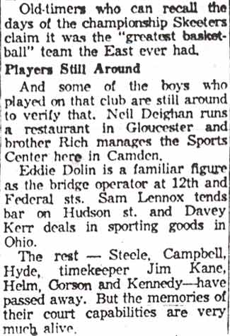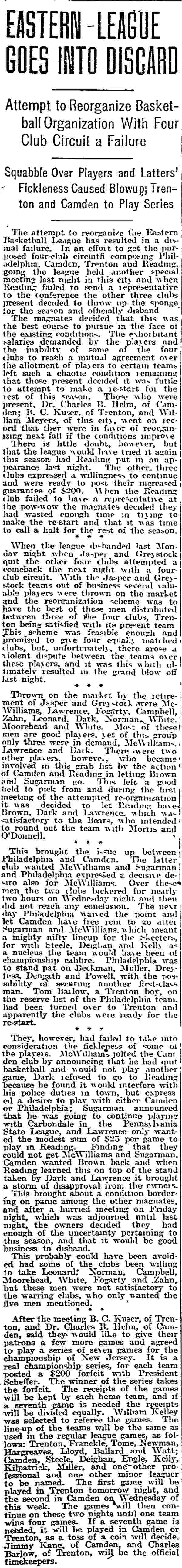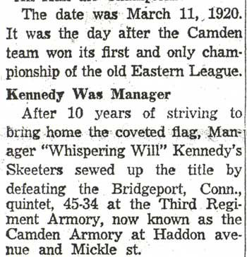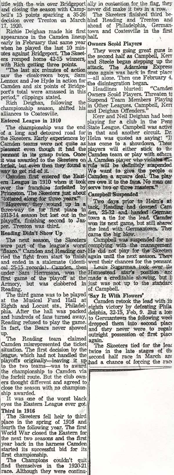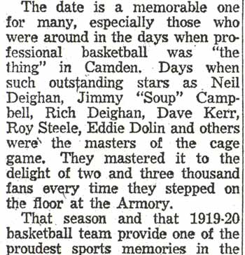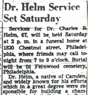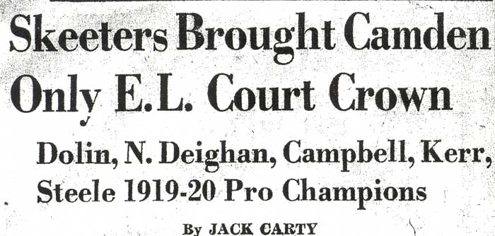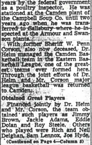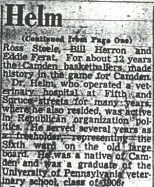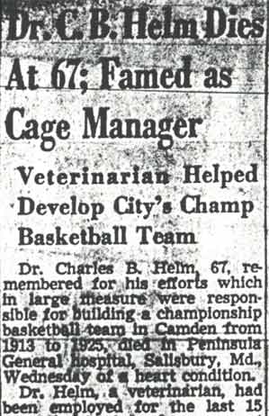 DR. CHARLES BLAINE HELM was born in Camden in 1884. He was a graduate of the University of Pennsylvania School of Veterinary Medicine in 1906. After establishing a veterinary practice in Camden at 900 South 5th Street where he also lived for many years, Dr. Helm involved himself in a variety of pursuits. Active politically as a Republican from the Sixth Ward, Dr. Helm served as city veterinarian in the days prior to the acquisition of police cars. Considered for a spot on the Republican slate in the commissioners race of 1927, he was not on the ticket, but was named as the city purchasing agent for Camden, and served as such through the administrations of Mayor Winfield S. Price and Mayor Roy R. Stewart. William M. Dilmore served under him as Assistant Purchasing Agent. Dr. Helm then took a position with the federal government as a poultry inspector, and worked at the Campbell's Soup Plant from 1934 through 1949, when he was transferred to Salisbury MD. Dr. Helm was most famous in the city of Camden for his involvement in professional basketball. He was manager and co-owner, with one-time Camden County Sheriff W. Penn Corson of the Camden franchise of the Eastern Basket Ball League from 1913 through 1925. The team, coached by William "Billy" Morgenweck was known as the Camden Alphas prior to World War I. The Alphas were the league champions in 1914-1915. 1917 was a year of turmoil in the world as the United States entered World War I. The New York State League and the Interstate Basket Ball League both suspended operations but the Eastern League began play in mid-November. On December 3 the league disbanded abruptly as two teams withdrew from the league without warning. An unsuccessful attempt was made to reorganize with a four team league and the league remained inactive until the 1919-20 season. One of Camden's players during this abridged season was future Olympic rowing star, Jack Kelly. He later would become the father of Grace Kelly, movie star and Princess of Monaco. After the abrupt season ending, Trenton and Camden agreed to play a best of seven series for the "Championship of New Jersey" with EBL President William J. Scheffer as referee. The first game was won by Camden 28-27 at Trenton on December 19, 1917. Two days later a second game was played at Camden and Trenton was the victor 47-19 but attendance was very poor. On December 14, 1917 the Dr. Helm called off the series due to the lack of fan interest. Dr. Helm renamed the team Camden Crusaders after World War I. The Camden five were champions again in 1919-1920, winning both halves of the split-season with a combined 30 and 9 record. The team was renamed once again as the Camden Skeeters for the 1921-1922 season. They were were one of the league's better teams, until it disbanded in 1923. Dr. Helm fielded a team in the a new Eastern Basketball League in 1925 (note the new spelling of "Basketball"), but the team did not do well, and that marked the end of his involvement the professional game in Camden. The Camden team was generally a winner in the league. Besides bringing players to Camden from out of town, Helm's team employed and/or developed many fine players from Camden, including Eddie Ferat, Sam Lennox, Roy Steele, Joe Hyde, Neil Deighan, and his brother Rich Deighan. Dr. Helm died in Salisbury MD on December 5, 1951 of a heart condition. He was survived by his wife Mabel, two brothers, and a sister. His nephew, Dr. David Helm Jr. was Camden's health inspector at the time of Dr. Helm's passing. |