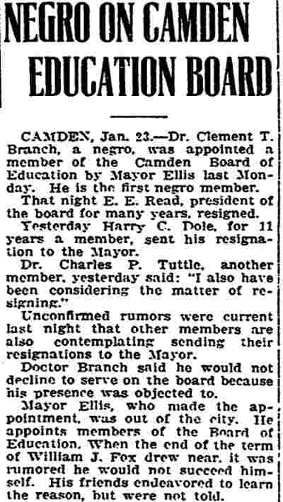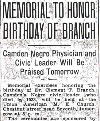 DR. CLEMENT T. BRANCH was a prominent physician and civil rights leader in Camden's black community from 1902 until his death on November 29, 1933. Born in Farmville VA on January 21, 1869, Clement Branch was educated in the public schools of Farmville, and received his college training at Virginia Normal and Collegiate Institute, later called Virginia State College. He studied medicine at Shaw University, Cornell University, and Howard University, where he graduated in 1900. He married Miss Bessie D. Avery, a schoolteacher of Petersburg VA in 1903. Dr. Branch first practiced medicine in Jersey City NJ, coming to Camden in 1902. He soon was prominent not only as a doctor but in the civic and educational affairs of the city. He was the first black member of the Camden Board of Education, and also was instrumental in effecting the hiring of black firemen and policemen. Dr. Branch was selected to be a delegate to the "negro Young People's Congress" in Washington DC, which ran from July 31 to August 6, 1906, as reported in the Trenton Times on July 30, 1906. Other delegates from Camden were attorney Powell K. Martin, the Rev. Dr J.H. White, and the Rev. Dr. R.F. Hurley. In 1912 Dr. Branch served as a delegate from New Jersey to the "Bull Moose" party's national convention, which nominated ex-president Theodore Roosevelt for President. Roosevelt would be was defeated by Woodrow Wilson. By 1930 Dr. and Mrs. Branch and purchased a home at 727 Walnut Street, He also owned real estate in Centerville, between 9th and 10th streets. A few doors down at 735 Walnut was businessman Robert Bumbrey, who would become well known in the 1930s for various activities. Dr. Branch was responsible for organizing the Hunton Branch Y.M.C.A. which in later years had buildings at 6th and Mechanic Streets and 6th and Liberty Streets. He was chairman of the Hunton branch until his death. Dr. Branch was always interested in efforts to aid children and to advance civil rights. For many years memorial services were held on the anniversary of his death in Camden. On May 4, 1940 ground-breaking ceremonies attended by City Commissioners, State and Camden Housing Authorities, A.P. Miller, general contractor, and Mrs. Bessie A. Branch, widow of the Dr. Branch were held for the government built public housing project, the “Village” named after Clement T. Branch, built in part on land which Dr. Branch had owned in his lifetime. By the 1940s 727 Walnut Street had become the home of Dr. Marcus F. Wheatland Jr., a protege of Dr. Branch. The Clement T. Branch Village housing project was formally dedicated on September 27, 1941. |