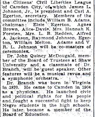 Seventh Ward A. Harry Moore Club, Seventh Street and Kaighn Avenue; Dr. Leroy Baxter, of Jersey City; Isaac Eason, Dr. Clement Branch, Rev. Robert H. Jackson, Mrs. Bertha Shippen Irving and Frank Suttill.