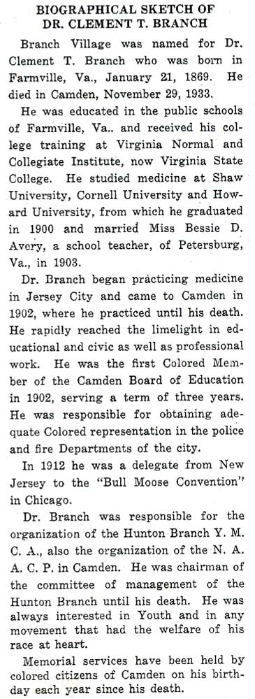 Biographical Sketch from the Clement T. Branch Village Dedication Program September 27, 1941 |