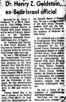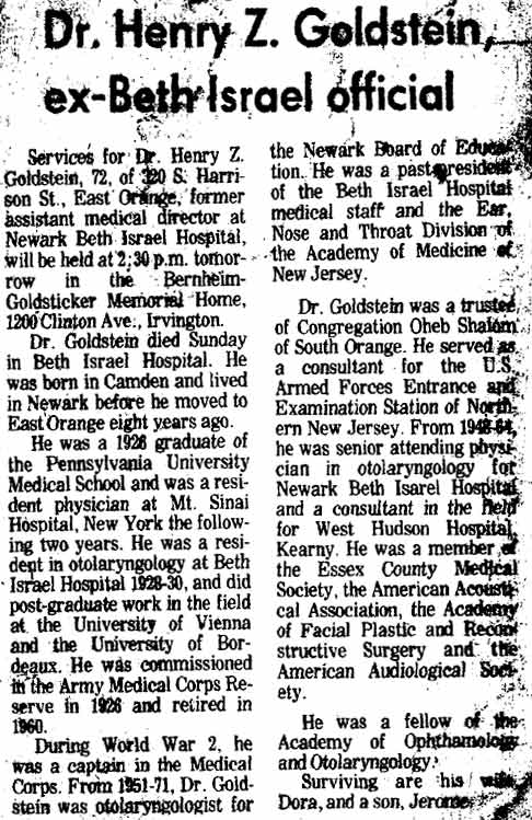 all hear Henry Goldstein speak a piece Commencement Day, At the time of the 1920 census, the Goldstein family was living at 1425 broadway in Camden. Henry Goldstein attended the University of Pennsylvania on a competitive alumni scholarship, and graduated from the University of Pennsylvania Medical School in 1926. He did post-graduate studies in the 1930s at the University of Vienna and the University of Bordeaux. After graduation, Dr. Goldstein was commissioned as a Second Lieutenant in the United States Army Reserve. He was was called to active duty with the Army at age 38, and served as a Captain, commanding the army medical unit based at the Camden Armory during a period in 1944. Henry Goldstein would serve America in war and peace until his retirement from the service in 1960. Dr. Goldstein did his residency at Mt. Sinai Hospital in New York, then became a resident in otolaryngology at Beth Israel Hospital in Newark NJ in 1928, and would continue his affiliation with that institution until 1964. After returning from the Army, Dr. Goldstein resumed his affiliation with Beth Israel, where he rose to the post of Assistant Medical Director. He had a twenty-year affiliation with the Newark Board of Education, and served as a consultant to the Armed Forces Entrance Examination Station of Northern New Jersey. He served as a trustee at his synagogue, Congregation Oheb Shalom in South Orange NJ, and was a member and officer in several professional organizations. Dr. Henry Z. Goldstein passed away on June 1, 1975. He was survived by his wife Dora and son Jerome. |