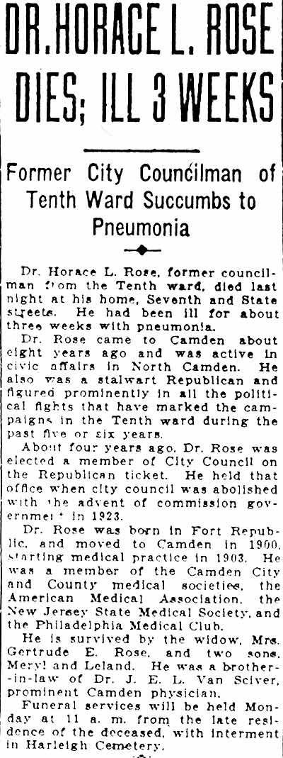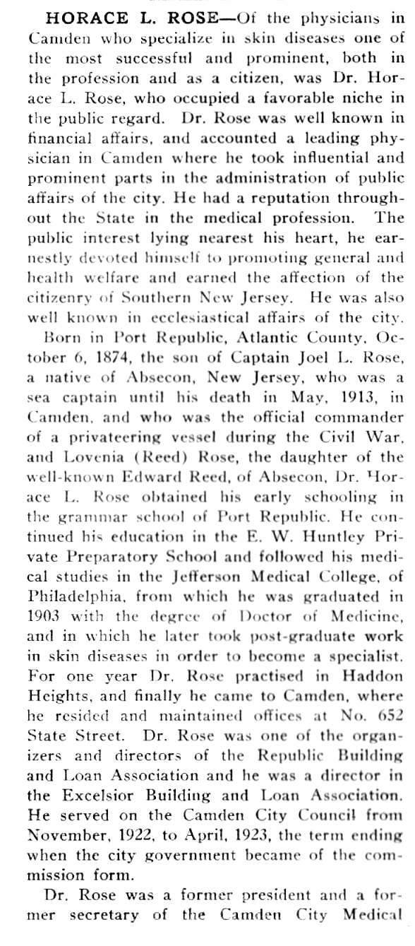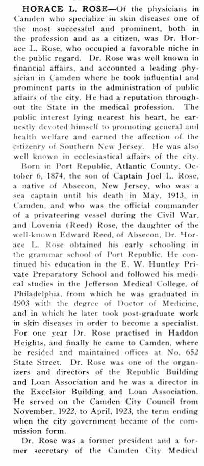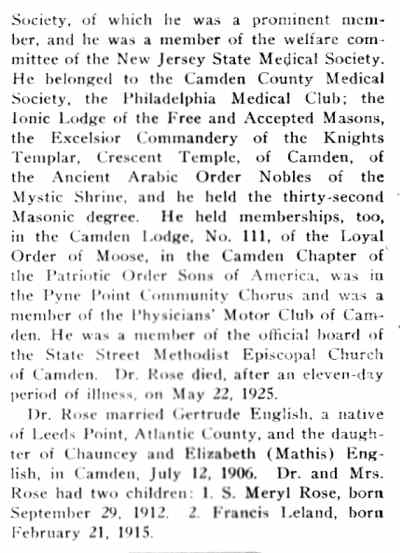 DR. HORACE LEWIS ROSE was born in Port Republic, New Jersey in 1874. Horace Rose moved to Camden in 1900. After receiving his doctorate from Jefferson Medical College in 1903 established a medical practice in North Camden. He made his home at 652 State Street. A general practitioner, he was affiliated with Bellevue Hospital at North 5th and Linden Streets, and with the Camden City Dispensary. Dr, Rose was a member of the American Medical Assocoation, the Camden County Medical Society, and was a member and past president of the Camden City Medical Society. A loyal Republican, Dr. Rose became active in local politics around 1918. He was elected to the old City Council in 1921, and served until that body was replaced by the City Commission in 1923. In 1906 Dr. Rose married Gertrude English. He died in May of 1925. He was survived by his wife and sons Sylvan Meryl and Francis Leland Rose. Francis Leland Rose, after graduating from Camden H igh School in 1933 and Amherst C ollege in 1937 , followed his father into medicine, receiving his M.D. from Jefferson Medical College in 1943. |