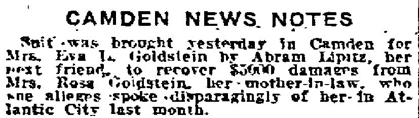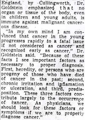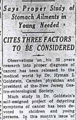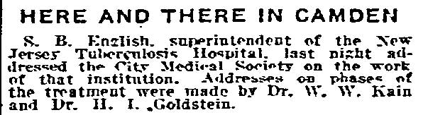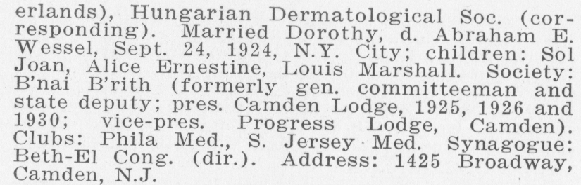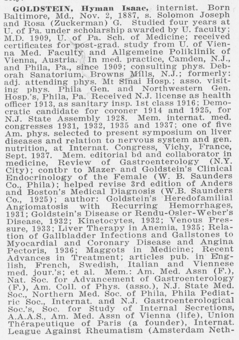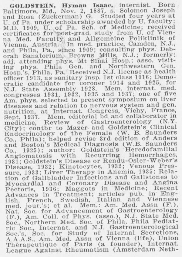 DR. HYMAN I. GOLDSTEIN was born in Baltimore MD on November 2, 1887, the oldest of four children of Solomon Joseph and Rose Zuckerman Goldstein. The Goldsteins moved to Camden NJ in the mid 1890s, and within a short time settled on broadway, south of Kaighn Avenue. Of the other Goldstein children, both Leopold Z. Goldstein and Henry Z. Goldstein would also become doctors. Daughter Sadie who would marry Dr. David E. Cooper, who practiced dentistry in Camden and South Jersey for many years. Hyman I. Goldstein was a 1905 graduate of Camden High School. attended the Medical School of the University of Pennsylvania, where he received his doctorate in 1909. He spent his internship at the Mount Sinai Hospital, the Northwestern General Hospital as well as at the Philadelphia General Hospital, and subsequently worked as an internist in Camden, New Jersey. At the time of the 1920 census, the Goldstein family was living at 1425 Broadway in Camden, and Dr. Goldstein was already engaged in the practice of medicine. He married Dorothy Wessel shortly thereafter. The marriage produced three children, Joan, Alice and Louis Marshall. Marshall later also became a physician, practicing in Miami, Florida. Dr. Goldstein practiced medicine, specializing in gastroenterology, and was involved in research, devoting much time to the study of Rendu-Osler-Weber disease. He contributed to the third edition of Textbook of Medical Diagnosis (Philadelphia, 1925) by James Meschter Anders (1854-1931) and L. Napoleon Boston (1872-1931). This book was first published in 1911. He also contributed to the book International Clinics (Philadelphia, 1918, 1921, 1927) as well as numerous journals. He was also worked closely on many cases with Dr. I.S. Ravdin, of the University of Pennsylvania. He is also noted as the discoverer of Goldstein's Toe Sign, a clinical sign characterized by increased space between the great toe and its neighbors, in cases of Down's Syndrome and occasionally in cretinism. Dr. Goldstein ran for coroner as a Democrat twice, in 1914 and in 1925, and for New Jersey State Assembly in 1928. He was unsuccessful in these ventures, however. Dr. Hyman Goldstein was still practicing medicine at 1425 broadway as late as 1951. He passed away in 1954, and is buried in New Camden Cemetery in Camden NJ. Dr. Goldstein's maternal uncle was Austrian timber magnate Isidor Zuckermann. |