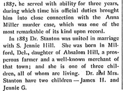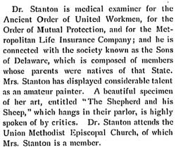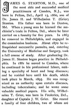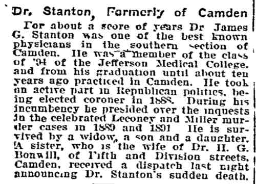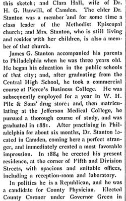 DR. JAMES GRIER STANTON was born to Dr. James H. Stanton and his wife, the former Wilhelmina Grier on April 15, 1860. After graduating medical school in 1881, he followed his father to Camden, and began practicing medicine. He married S. Jennie Hill of Milford DE in 1883. In 1884 Dr. and Mrs. Stanton had built a residence and office at 821 South 5th Street, the corner of South 5th and Division Streets in South Camden. Dr. Stanton was a Republican, and ran at one time for the post of County Physician. He served for three years as County Coroner beginning in 1887, during which time he was involved with the Anna Miller murder case. He also served as medical examiner for the Ancient Order of United Workmen, for the Order of Mutual Protection, and for the Metropolitan Life Insurance Company. His wife was well known in local art circles as a painter. Dr. Stanton was a member of the Union Methodist Episcopal Church. In 1890 his sister, Clara Stanton, married Dr. Howard G. Bonwill, who had studied medicine with their father. Dr. James Grier Stanton passed away September 4, 1909. |