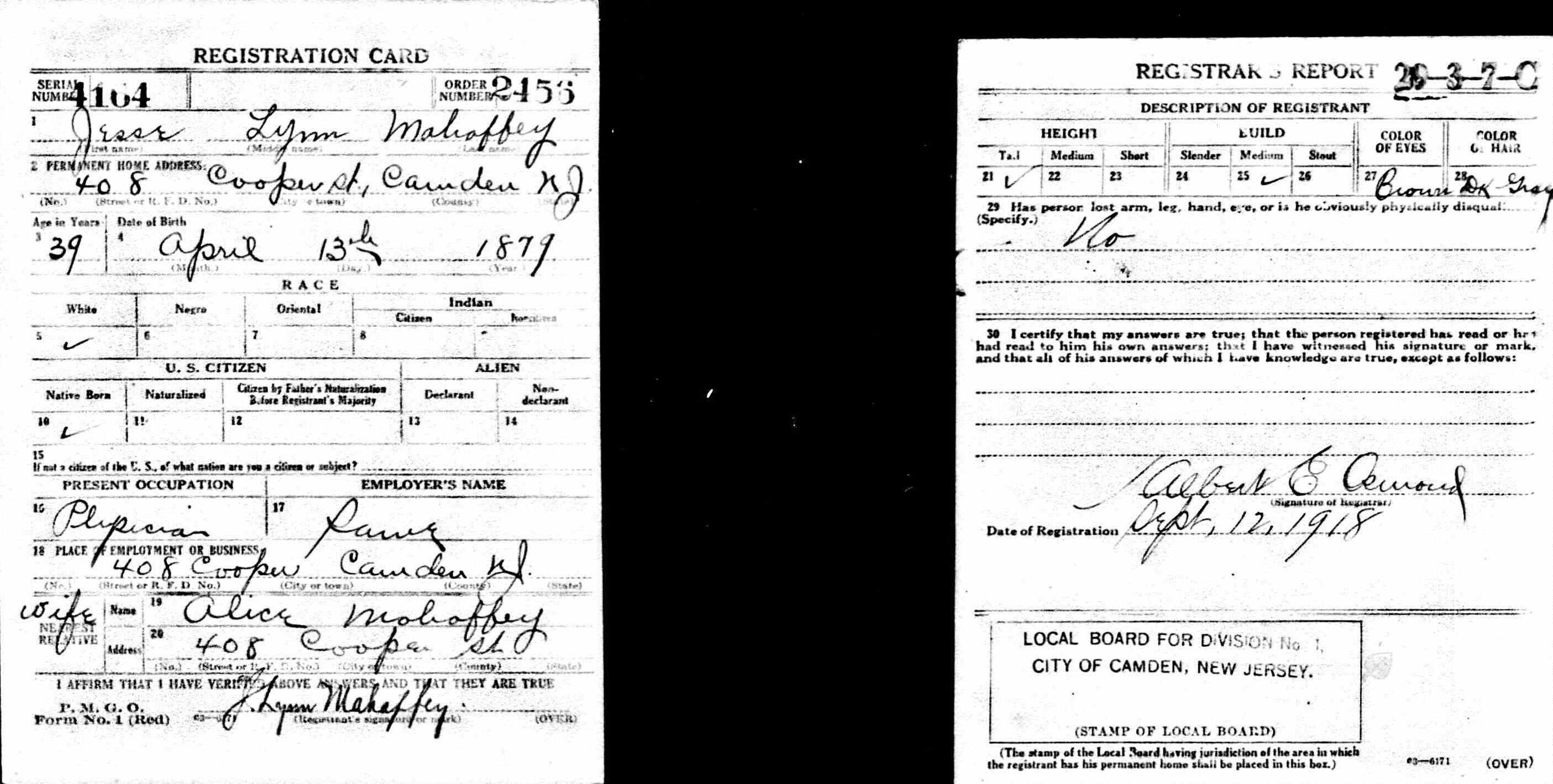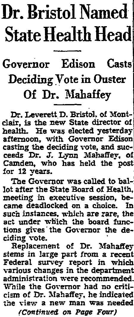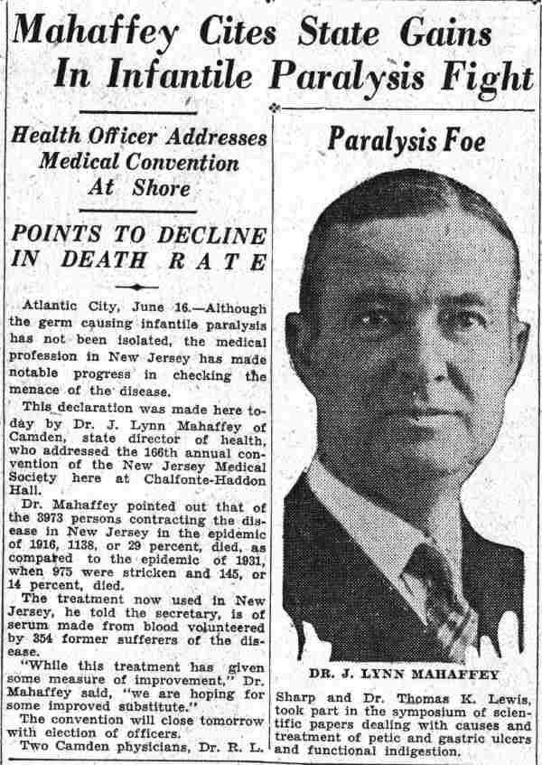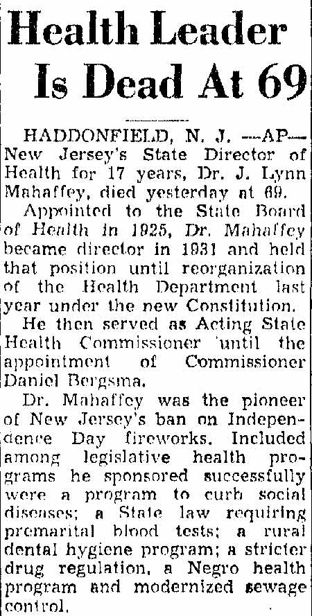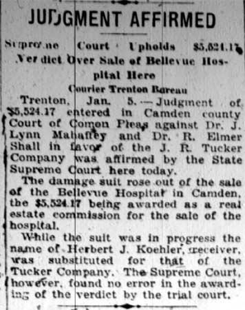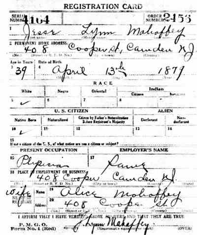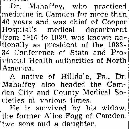DR. JAMES LYNN MAHAFFEY was born in Hillsdale, Pennsylvania in 1879. After graduating from Hillsdale High School in 1897 He attended the Teachers College of Indiana, graduating in 1898, then went to the Medico-Chirurgical College, graduating in 1902. He was a general practitioner. Dr. Mahaffey was appointed to the staff of Cooper Hospital and served as Chairman of Medicine from 1909 through 1929. Dr. Mahaffey and Dr. Elmer Shall organized the Bellevue Hospital in Camden, at North 5th Street and Linden Street, in the mansion that had been the home of Senator William Joyce Sewell. The hospital opened up on March 21, 1921. Dr. Mahaffey was a member of the State Board of Health from 1926 through 1931, and was Director of the State Board of health from 1931 through 1946. The North Camden Trust Company began business on May 4, 1926 in the banking house on Penn Street at North 6th and the Bridge Plaza. Dr. J. Lynn Mahaffey was the first President. He was also a member of the Camden Chamber of Commerce and was on that group's Board of Directors in 1928. Dr. Mahaffey's professional affiliations included membership in the Camden County Medical Society, where he served a term as President; the State and Provincial Medical Officers of North America; the New Jersey Crippled Children's Committee; and he served on the executive committee of the State Tuberculosis Association of New Jersey. Dr. J. Lynn Mahaffey was married to Alice Fogg. The marriage produced three children, J. Lynn Mahaffey Jr., Albert Mahaffey, and Alice F. Mahaffey. The Mahaffeys made their home at 408 Cooper Street in the late 1910s and early 1920s before moving to Haddonfield. New Jersey. Last a resident of Haddonfield, New Jersey, Dr. J. Lynn Mahaffey passed away on November 1, 1948. |