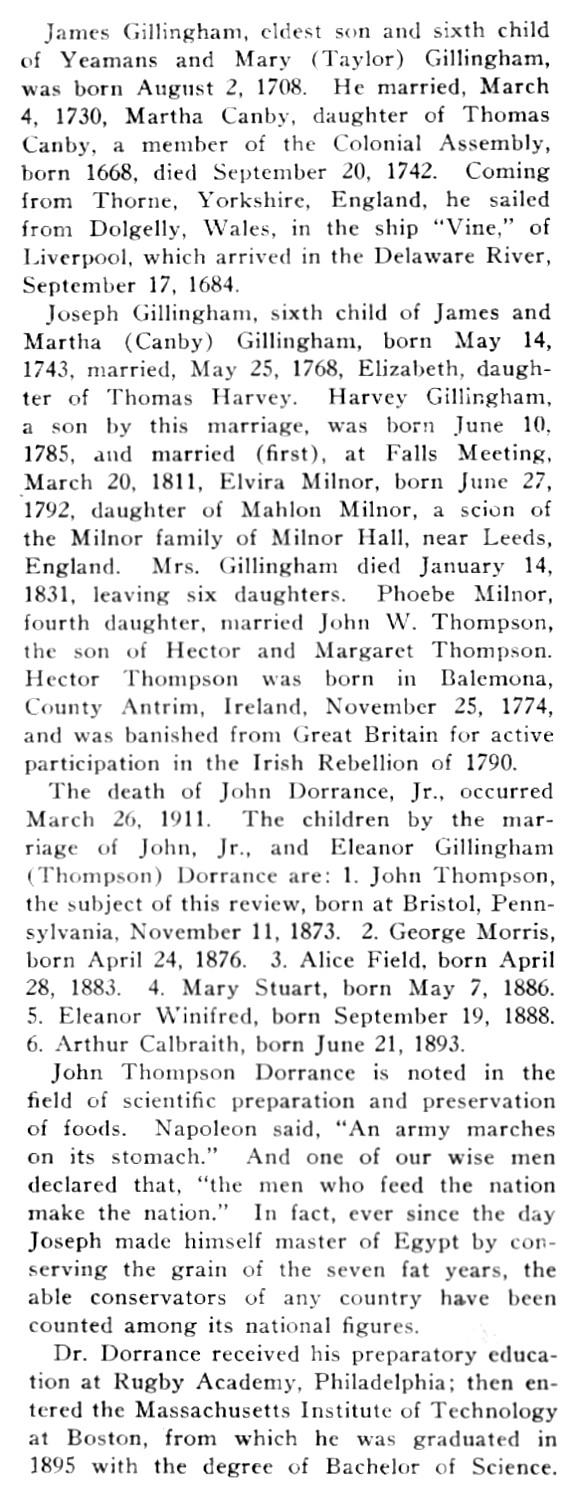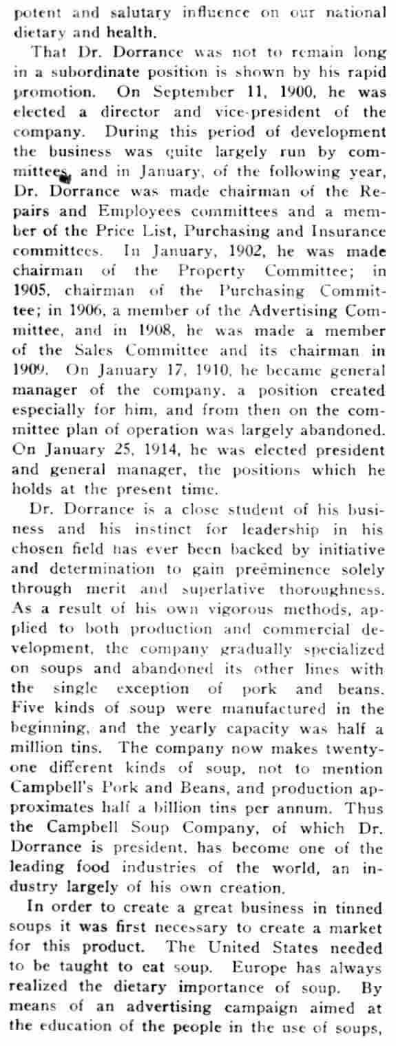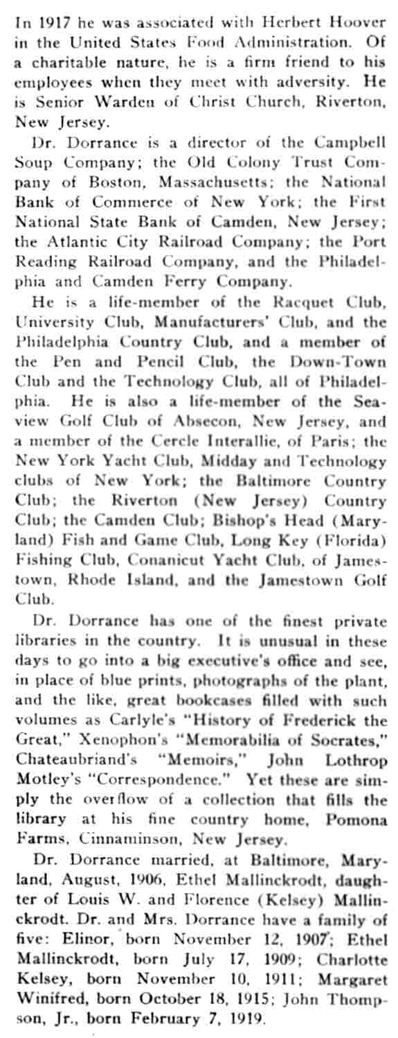 DR. JOHN T. DORRANCE, Ph.D., a brilliant scientist who, spurning the life of a university professor took a position with Joseph Campbell in Camden in 1887, whose company was to that time somewhat struggling firm among many engaged in canning and preserving vegetables and fruits. While with Campbell, Dr. Dorrance invented the condensed soup that made Campbell Soup a household name around the world. As brilliant in business as he was in science, he rose in the Campbell organization and was elected president in 1914. Dr. Dorrance died on September 21, 1930 of heart disease at his home in Cinnaminson, New Jersey. He was succeeded as President by his brother, Arthur Dorrance. The Dorrance family still holds major positions among the stockholders of Campbell Soup. |