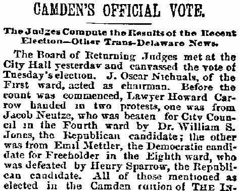 In 1878 Dr. Donges was elected a member of the City Council from the Eighth Ward, which at the general elections (of the time) is strongly Republican. On this occasion, however, it gave the doctor a handsome majority as the Democratic candidate, and he served six years consecutively as a member of Council, and was president of that body during the year 1883. During the year 1879, when the smallpox prevailed to an alarming extent in Camden, he was a member of the sanitary committee. For his efficiency as an executive officer and as attending physician – free of charge- when the unfortunate people were stricken with the loathsome disease, the city council unanimously passed the following resolutions: