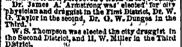 Resolved , That the sincere and heartfelt thanks of this body and community are hereby extended to J.W. Donges, M.D., member of City Council from the Eighth Ward and member of the Board of Health, for his indefatigable, self-sacrificing, and successful efforts to obliterate the loathsome disease that infested our city.