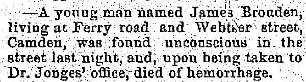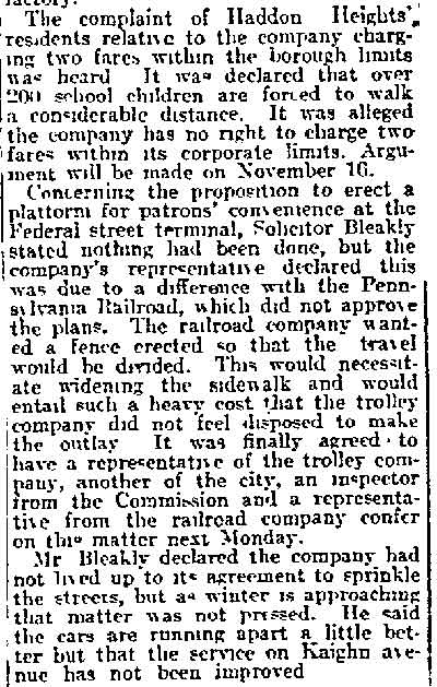 Old Centreville Families WHEN a larger community annexes an adjoining district the newer area is generally regarded, for a time at least, as a step-child. Older residents of East Camden will bear out that truism when they recall how difficult it was to obtain improvements. Years before, Newton Township which became part of Camden, had had the same experience. Under such circumstances, it requires tireless energy on the part of leading men to get what their district needs. Demands often go unheeded unless the community is fortunate in having those of spirit who insist on street improvements, water extension, lighting facilities and schools. That was more in evidence half a century ago than now, of course, for Camden itself was little more than a large village. Down in Centreville there were men who looked after the interests of their constituents, who slowly but surely obtained, improvements and who insisted on being recognized by the powers that be. No one may think of old Centreville without thought of Dr. John W. Donges, whose value to not only that section but Camden at large, has been expatiated upon in these annals. He was not only a leading physician, with a practice extending into Camden, but a leader in many civic movements, and any article on that era would be incomplete without allusion again to the doctor whose services as a real family physician are part of the traditions of many old families. Came Here In 1872 He came here in 1872 from Schuylkill County, Pennsylvania, when his health was affected by overwork through loyalty to his patients. He bought the drugstore at Ferry Avenue and Broadway, remaining there for many years. It was there Supreme Court Justice Ralph W. E. Donges spent his boyhood. There, too, Dr. Clarence B. Donges and Attorney Raymond Donges were boys. Grant E. Kirk, clerk in his store, later becoming a physician and for several years a member of council and at one time being prominently boomed for mayor, married their sister. Dr. Donges was elected to council in 1878 on the Democratic ticket, itself an evidence of the high regard in which he was held, for the Eighth Ward generally was rock-ribbed Republican. Until the early part of this century he resided in his old place, but later went to broadway and Clinton Streets. In later years, after he had retired, he was city assessor, "just to keep busy." He died a few years ago, well in his 80s, mourned by a great host of Camdenites. There was another widely known Centreville family of the old days, that of Samuel Mills, who had his own abattoir at broadway and Jackson Street, where city-dressed meats were provided before the days of car refrigeration brought supplies from the great packing places in Chicago. His son, Charlie, was long a member of the Board of Education, while another, William, was a city councilman. Edward Milis, another son, was excise commissioner 35 years ago in the days when there was plenty of trouble with Sunday sellers. Cornelius Schepperkotter was a factor in politics down that way, too, having a grocery store on ferry avenue at Ninth, later moving to the southwest corner when the Charles Sumner School was built. That school was torn down two years ago for the recreation center. Schepperkotter was a member of the old Board of Public Instruction in the late 90's, named by Mayor Cooper B. Hatch. In later years and until his death, he was superintendent of Evergreen Cemetery. He was father of Mrs. Frank S. Albright, wife of City Clerk Albright. Frank Covely Shortly after the New York shipyard was opened, there moved to the "Hill" Frank D. L. Covely, who became a joiner and for years was foreman of the joiner shop. He was widely known as a secret society man and also as an effective campaign speaker for the G. O. P. He was a member of the Board of Education. He sought to go to council, but that was at the time kirk was a power in the ward. Covely laughingly used to tell of a meeting all set for him from which all save the colored folk were drawn away through strategy of his party opponents. But for ten years he was a member of the Board of Recreation Commissioners. That movement owed much to his work. Nor did he forget his colored friends, for he had a playground established for them at ferry avenue and Phillips Street and the large one [Staley Park- pmc] at Seventh and Jefferson streets. Long afterward that was named for another city official, but Covely's friends said it should have been for him, as a monument to his services for the boys and girls of Centreville. He died a few years ago at Bellmawr in his 70s, after a hectic experience as a chicken raiser at Port Norris. There, too, was William Dorrell, superjntendent of the old "Narrow Guage" who was one of the leading spirits in the paving of Broadway, nearly 60 years ago the big issue of that section. He lived in a house along the railroad still standing, as the hospital and dispensary of the shipyard. Mention has been made of the Ferrises, the Helmbolds, the Yeagers, of Squire James D. Chester and Squire F. Joseph Rouh. There was also William O. Thompson, the leading contractor down that way for many years and Theodore Tiedeken, who established the wagon works on Van Hook Street, Martin Ewe, who had the hotel at Broadway and Emerald, and down the street a bit James Croker, who operated Tammany Hall. Forty years ago there was one of the best young athletes of the city, Thomas Nicholas, now retired Camden fire chief. He was down in old No. 3 with Bill Rose, long a fire captain, Bill Miller, Al James, Sam Lodge, Gus Dold and Jim Ware. Many of these old timers have passed on, but others are still in the flesh but scattered to all parts of the city but it may be said the survivors look back on the days that were down there in Centreville with an interest that does not dim with the passing years. |