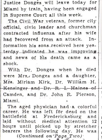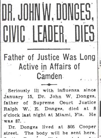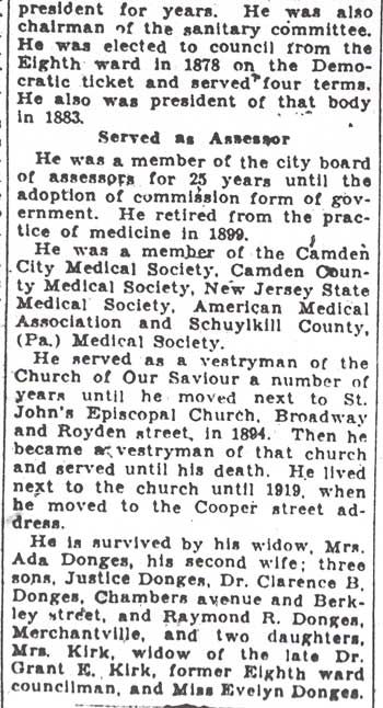 DR. JOHN WASHINGTON DONGES was born at Stouchburg, Berks County PA, September 18, 1844. to Irish immigrant parents. At 14 he took a job in a pharmacy. Enlisting in the Army at the outbreak of the Civil War, he was seriously wounded at Fredericksburg in December of 1862, and sent home. Returning to the study of medicine, he graduated from the University of Pennsylvania. He practiced medicine in Donaldson PA for nine years before coming to Camden in 1875, opening up a pharmacy at 1801 Broadway, the corner of Broadway and Ferry Avenue. This building at is still standing, although vacant, in July of 2003. He employed Francis J. Bicker Sr. as a pharmacist until bicker received his M.D. from Jefferson Medical College in Philadelphia. He subsequently employed Grant Elmer Kirk in a similar capacity. Dr. Donges and his family were still living there as of 1891. By the time the 1897 edition of the Biographical Review was published, Dr. Donges had moved to 525 Broadway, and Dr. Grant Elmer Kirk, who had married daughter Miriam Donges, was practicing at 1801 Broadway. He later moved to a fine house at 805 Cooper Street, where they remained through at least 1920. A Democrat, he served as a City Councilman for six years from the Eighth Ward, and was President of City Council in 1883. In 1879, Camden was struck with an outbreak of smallpox. Dr. Donges worked tirelessly to treat the sick and contain the outbreak. His work was recognized in a series of City Council resolutions printed below. Dr. Donges practiced medicine in Camden until 1899, when he retired to pursue other interests. Dr. Donges was married to rose marguerite renaud , of Phildelphia on December 22, 1866. Dr. and Mrs. Donges had five children, Miriam E., Clarence B., raymond r., evelyn l., and Ralph W.E. Of his children, Clarence Donges was, like his father, a prominent physician in Camden for many years. Ralph Waldo Emerson Donges studied law under Judge John W. Wescott and had a distinguished career as a jurist in New Jersey, including many years as a justice on the State Supreme Court. Raymond R. Donges also was a well known lawyer in Camden. Dr. Donges served on the Board of Directors of Camden National Bank as late as 1916. He was a member of many professional, fraternal, and civic organizations, including the Thomas M.K. Lee Post No. 5, Grand Army of the Republic; the Odd fellows, and the Masons. Rose Donges passed away on January 26, 1911 and was buried at Harleigh Cemetery in Camden. By 1919 he had remarried. At the time of 1920 census, Dr. Donges, then 75, and his second wife, Adelaide (Ada), were living at 805 Cooper Street in Camden NJ along with youngest son ralph w.e. donges . Ada Donges was active in the Woman's Club of Camden, N.J. The 1930 census reveals that they were living in Miami Beach FL in April of 1930. Dr. John W. Donges died at the age of 87 on February 5, 1931. He is buried at Harleigh Cemetery in Camden NJ. His wife, Adelaide, passed away in 1948, and was buried with her husband. |