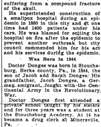 The childhood and youth of Doctor Donges were spent in the village where he was born. He first attended a private school, taught by his sisters, and afterwards spent about three years as a student in the Stouchburg Academy, then taught by Mr. Thomas S. Searle. At the age of fourteen years he secured a position as clerk in a drug-store at Minersville, Schuylkill County PA.