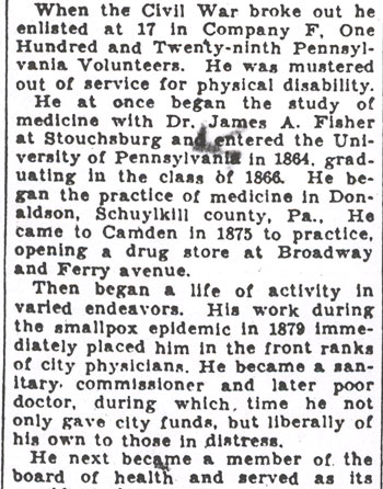 He soon afterward returned to Minersville, where he resumed his former occupation in the drug business. While here he began studying medicine under Dr. Theodore Helwig, a prominent physician of Minersville. After a year he returned to his home in Stouchburg, and there continued his studies under Dr. James A. Fisher. In 1864 he entered the Medical Department of the University of Pennsylvania, and was graduated in the class of 1866. In the following August he began the practice of medicine at Donaldson PA, and continued it uninterruptedly for nine years, having there acquired a large practice. Ill health, caused by over-work, induced him to think of discontinuing active practice and engage in the drug business. In 1875 he purchased the drug-store, which he has since owned and conducted, at the corner of Broadway and Ferry Avenue, in Camden, where he now has a large and increasing practice.