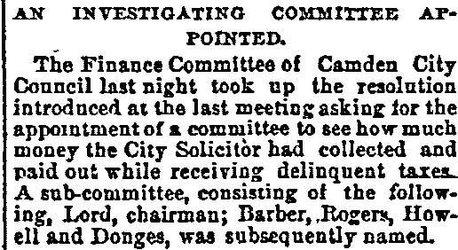 James Dudley Claudius Bradshaw - James M. Cassady - John W. Donges Josiah D. Rogers - Henry B. Wilson Sr. - Jonathan Burr Edmund E. Reed - Christopher J. Mines Sr. - William P. Tatem Jesse E. Hueston - E.E. Reed Jr. - George W. Gilbert - William S. Scull William W. Bozarth -John Burr - Charles Wilson - Rudolph W. Birdsell John W. Wartman - Samuel Hibbs - St. John's Episcopal Church Broadway Methodist Episcopal Church Camden Fire Insurance Association |